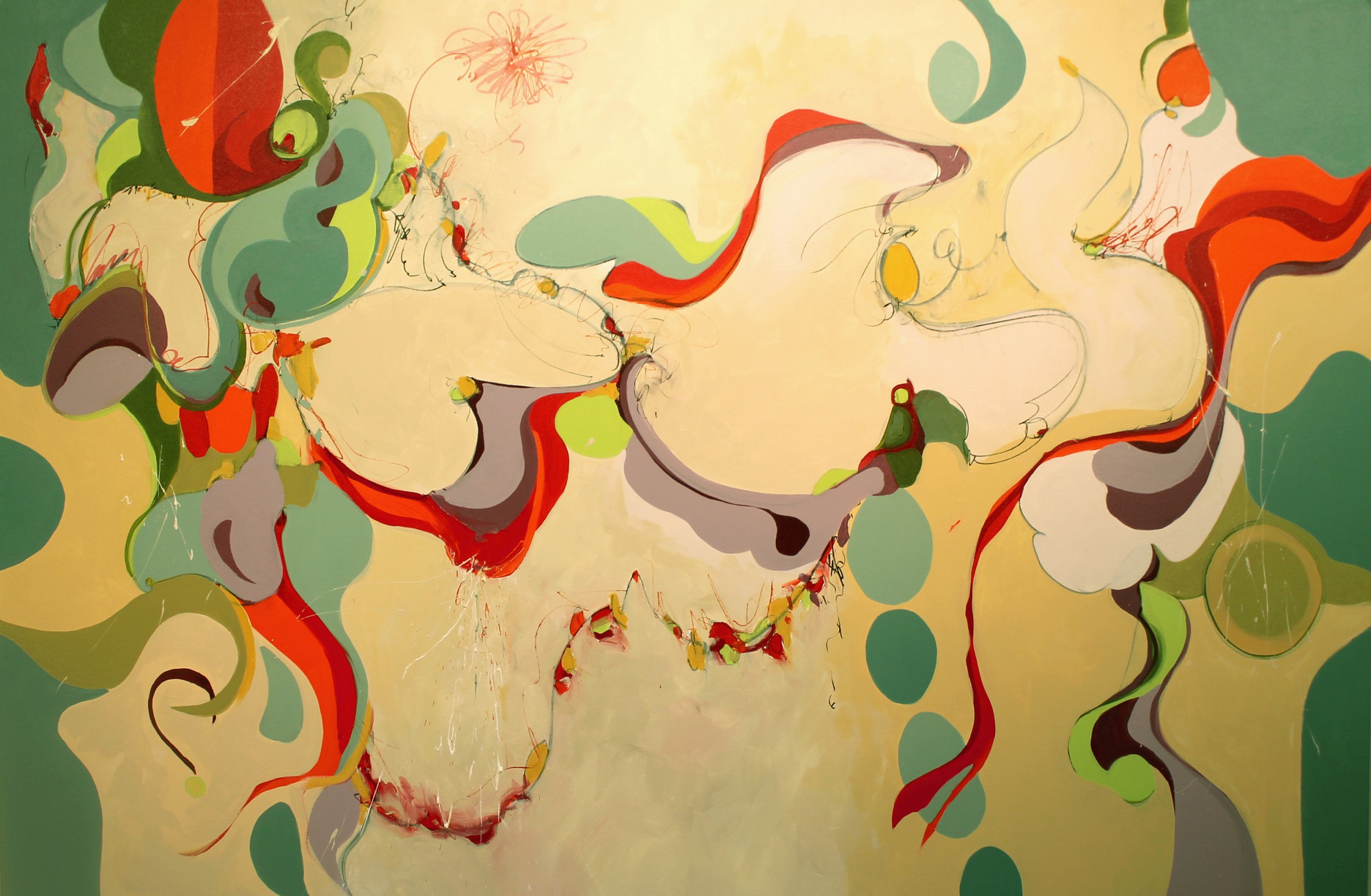 In my “Abstract Stories” series, those atmospheric spaces became increasing bounded by spontaneously drawn shapes. Painted in shades of ochre-tinted white –the color of bone-- the enclosed spaces began to take on shapes that suggested something as intimate and normally hidden as bone; organic shapes that suggest body parts unveiled here and there as though to tease a lover.