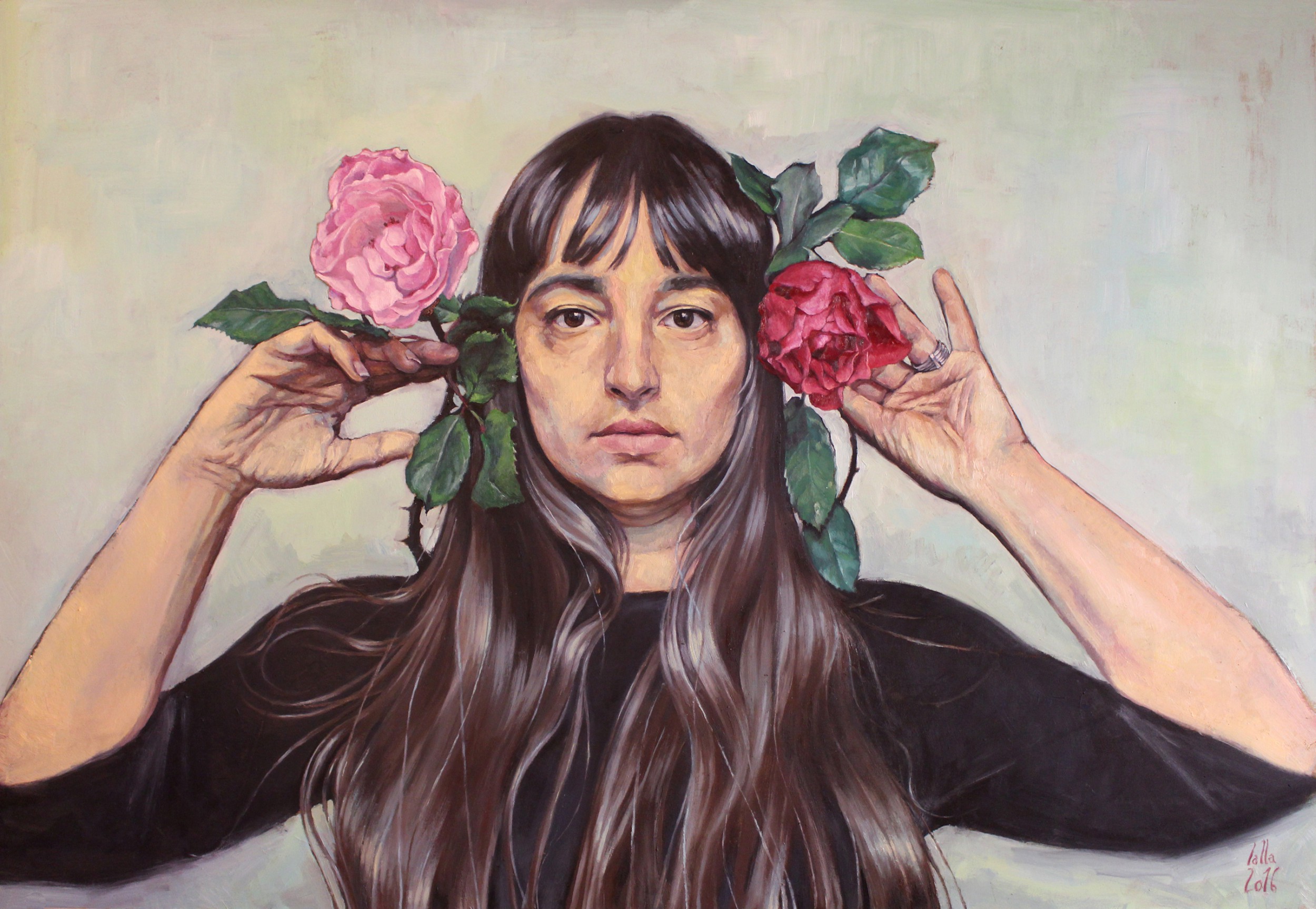 The painter is dressed in black (very simple, so as not to distract from the face). The only gem is a silver ring to replace the place that was faithful. She holds in her hand, near the head, the autumn roses she had collected in her childhood home garden and had donated her for her birthday. They are a bit tired and spooked ... maybe a reminder of the beauty that is aging by aging ... To the fall of life. Perhaps there are other symbols: the same term as "passing time" for hair with silver threads, but still feminine, soft and loose, so light, framing the oval face almost to invoke the veil of Mary (the painter is A teacher of Art History and Madonna has seen her so many) ... and the roses have their thorns, so approaching the face are almost "dangerous" and probably recall the crown of Christ's thorns and the passion just crossed by the author . He shows his wrinkles and palm of hands that he has a lot of creases, so he does not want to look more beautiful than he is, maybe he is happy to see his wrinkles and white hair ... to survive his past. Type a warrior who shows his scars proudly. Look in the eyes of the spectator, sad or perhaps proud, and therefore his would be more a laurel crown than a thorn, a crown of glory.