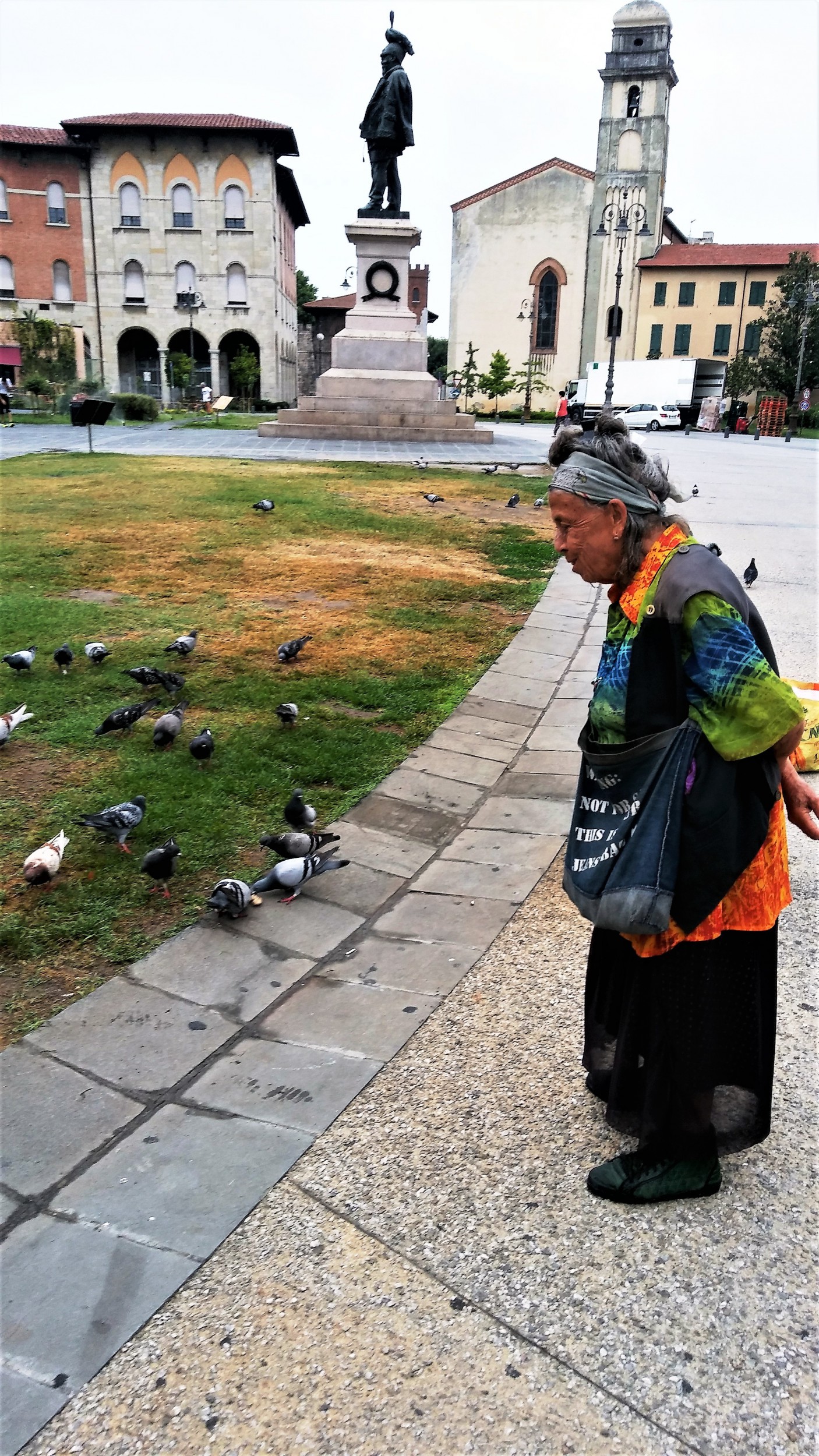 Old woman in very colorful clothes, look at the pigeons in the center of Pisa. The contrast between the pigeons' gray, the stone floor and its beautiful clothes stands out, well maintained, though its conditions are not rich in wealth. His dignity prevails over poverty. His look is proud, serene and confident. It's an old grandma we all want to have.
