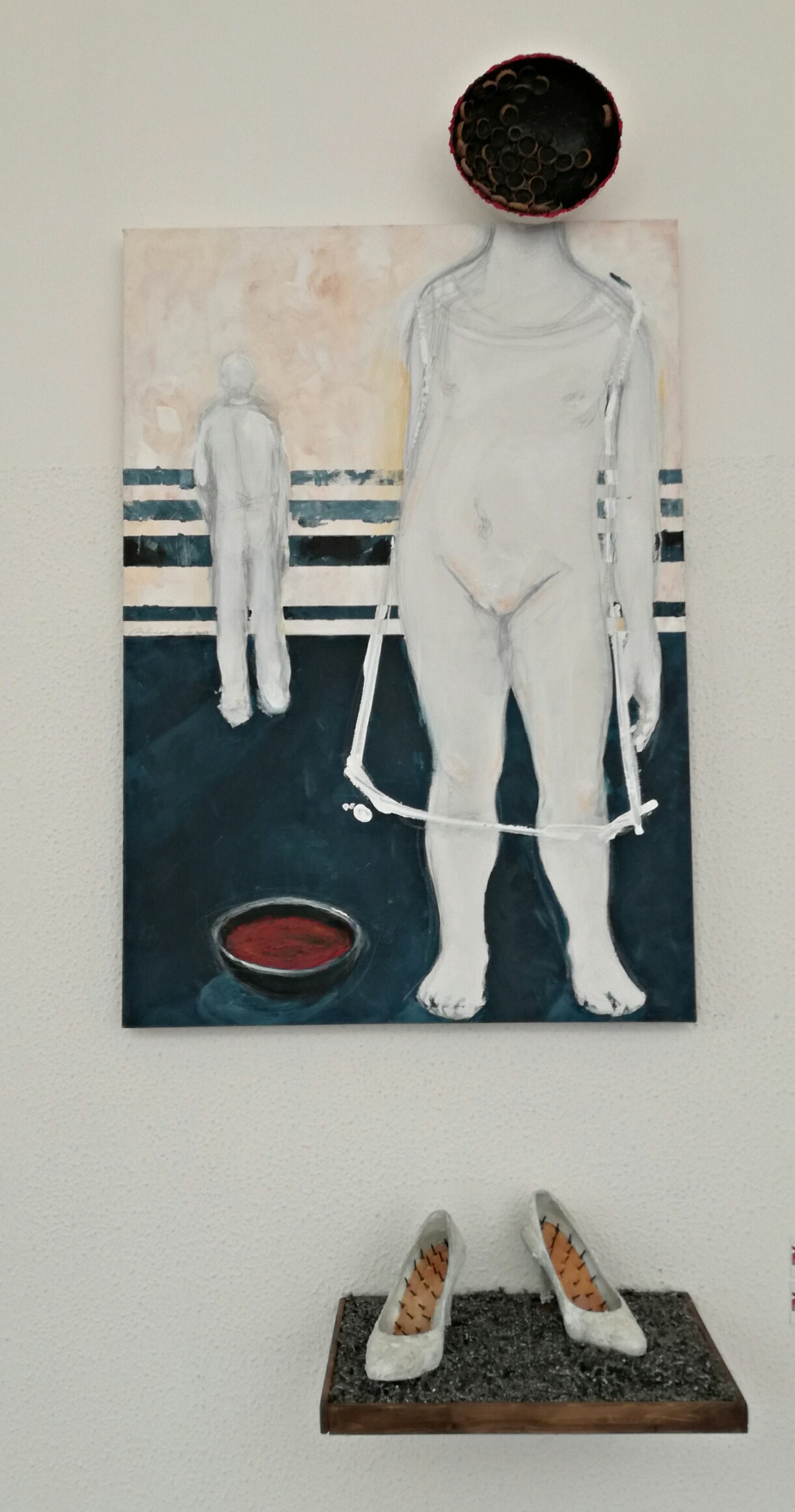 She waits for the day when the world will force her to show her femininity (heels) for which it will inflict her constant judgments, nails in the flesh (the nails inside the heels peeking out from a flesh-colored base ... the woman's flesh itself: the nails do not come out of the shoe, they enter the female).