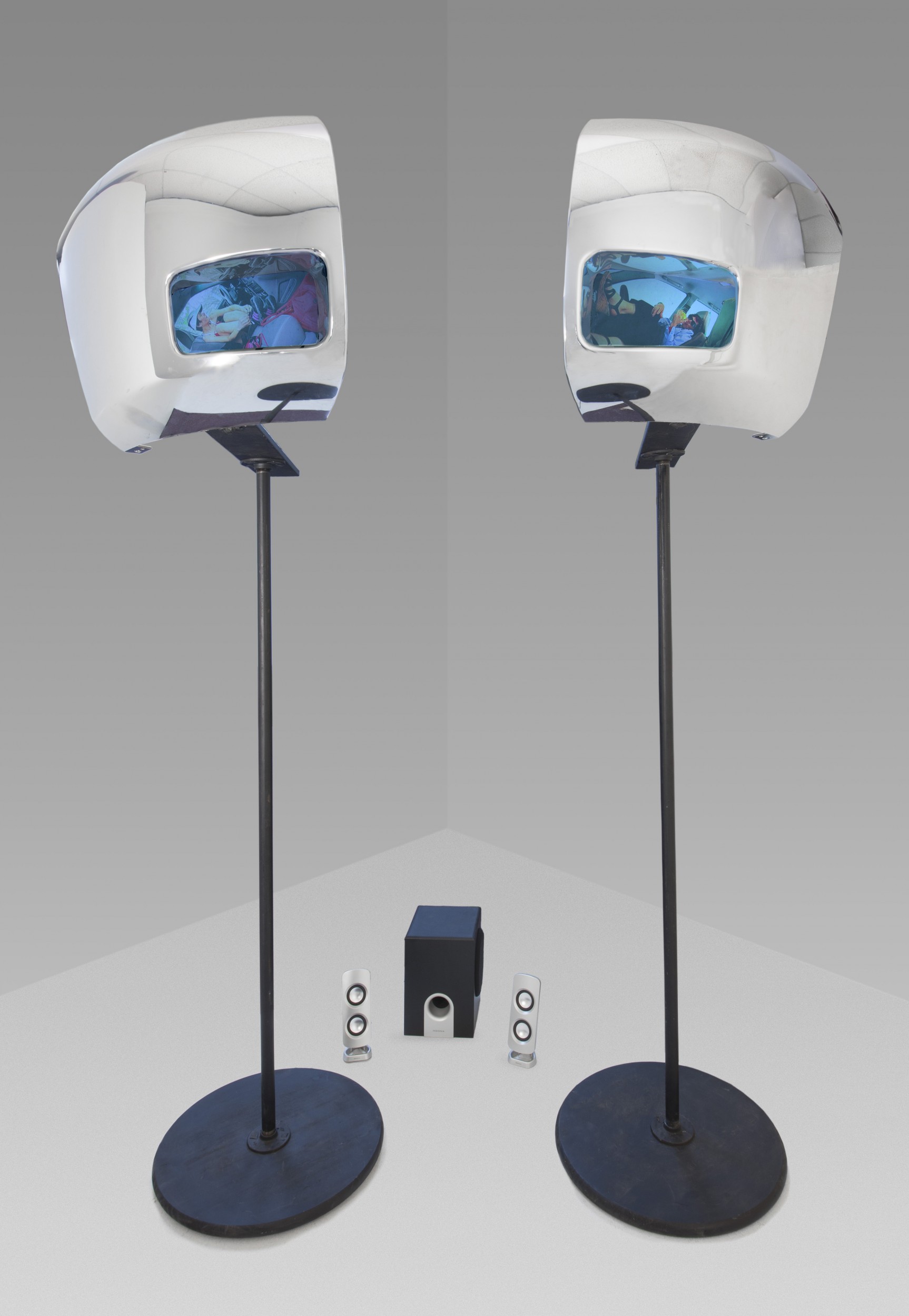 Installation view at "Detroit Boom City", 2016, The Pickle Factory. Found Dodge fenders, steel, wood, pico projectors, speakers. Videos are viewed through foglight apertures and run on independent loops. Video content: activities performed inside a vehicle including changing clothes, eating, loading boxes, searching for lost items, napping,and learning Japanese.