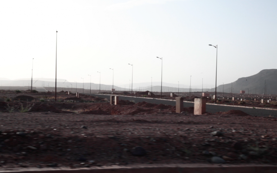 At the moment of this shot, these hints of a city have something absurd. Without life or social body, they remain cemented in a sort of frozen temporality. The place thus evokes a strange compound: it has something of the conquest of the empty plains of the New World, or the post-war reconstruction projects, else the intensive urban planning in China ... Yet the context is quite different. Designed as low architecture, these assertions of construction have their own singularities. The expanse strangely combines its old and new legends: fitting in both with the dated modern architecture of the mid-20th century and the reality of contemporary Moroccan society.