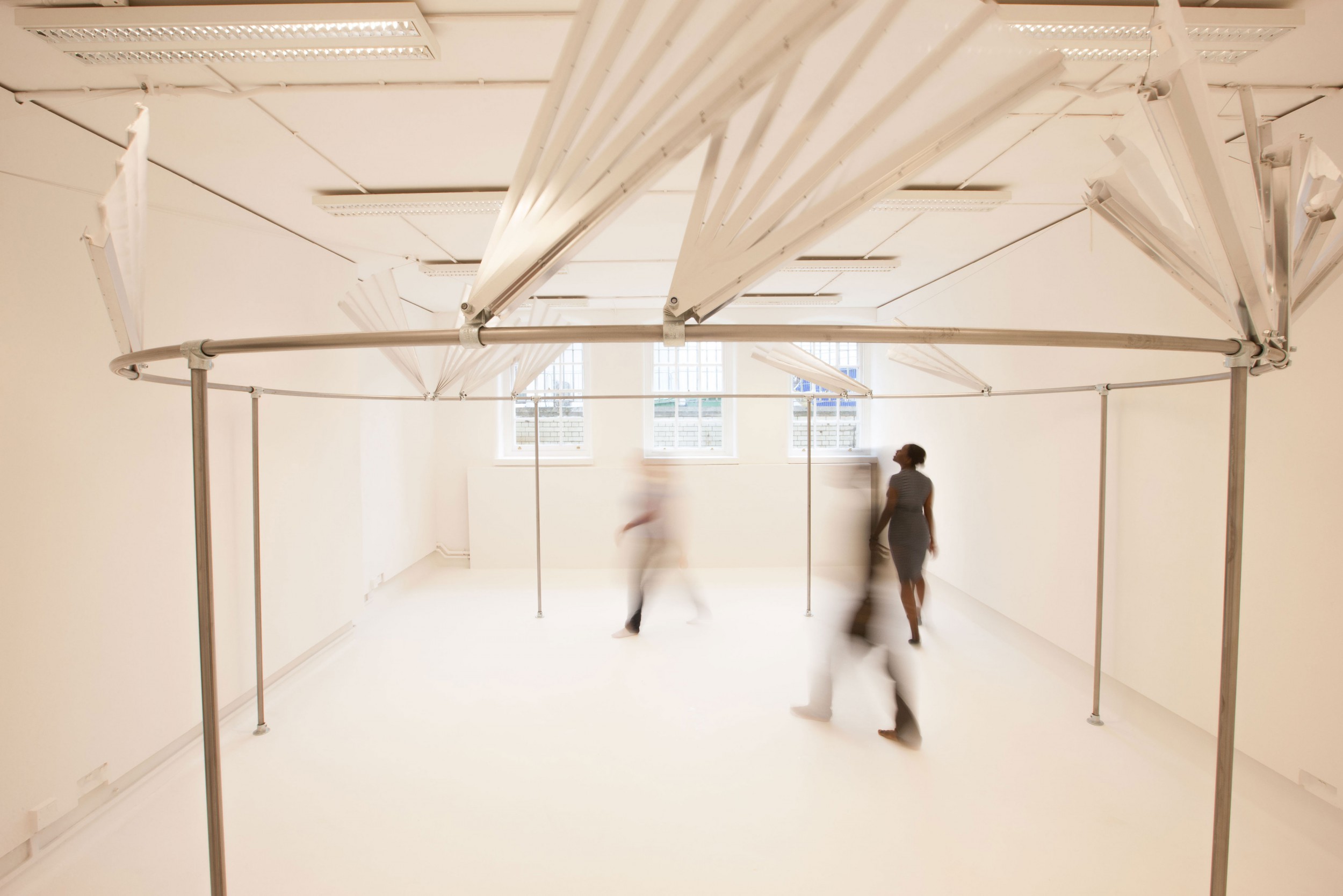 By pushing the doors to enter the room, the unconscious viewer choose without noticing to surrender to the proposed path. As the structure awakes, natural physics' law of gravity and motion operate in synchronicity and exert a balanced tension between polarities. Thrown back in a unified field, the performer contributes involuntarily to the whole.