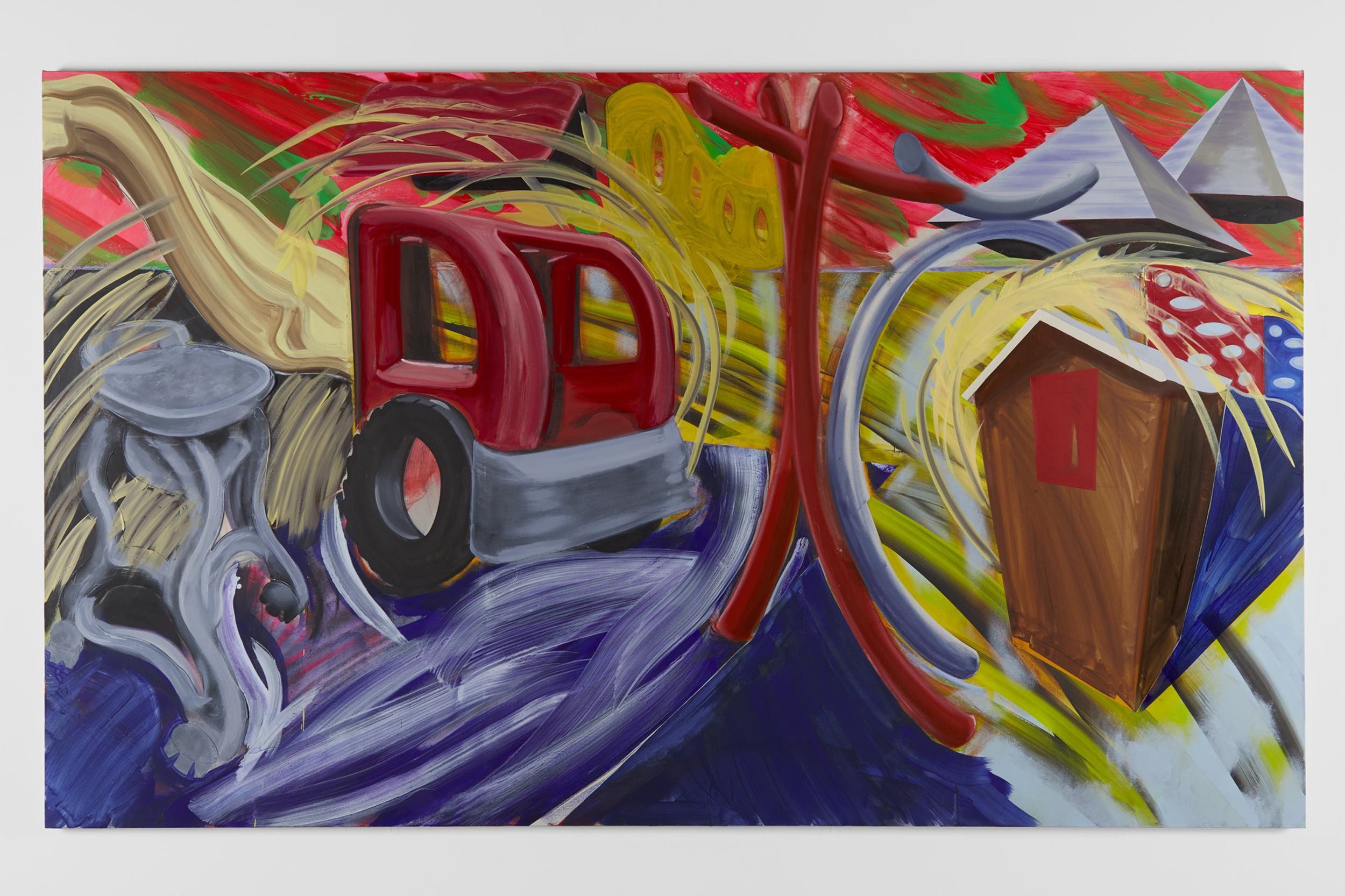 Hatfull’s new paintings reveal the artist’s most experimental inclinations, a restless reshuffling of elements (furniture foam, food containers from chain restaurants, playground structures, etc.) through which the artist calibrates a personal offbeat, absurdist lyricism. Stains are important—they speak of forms revealing themselves and consuming themselves at the same time. Vessels are important—they hold a charge. It’s a turbulent business, life.