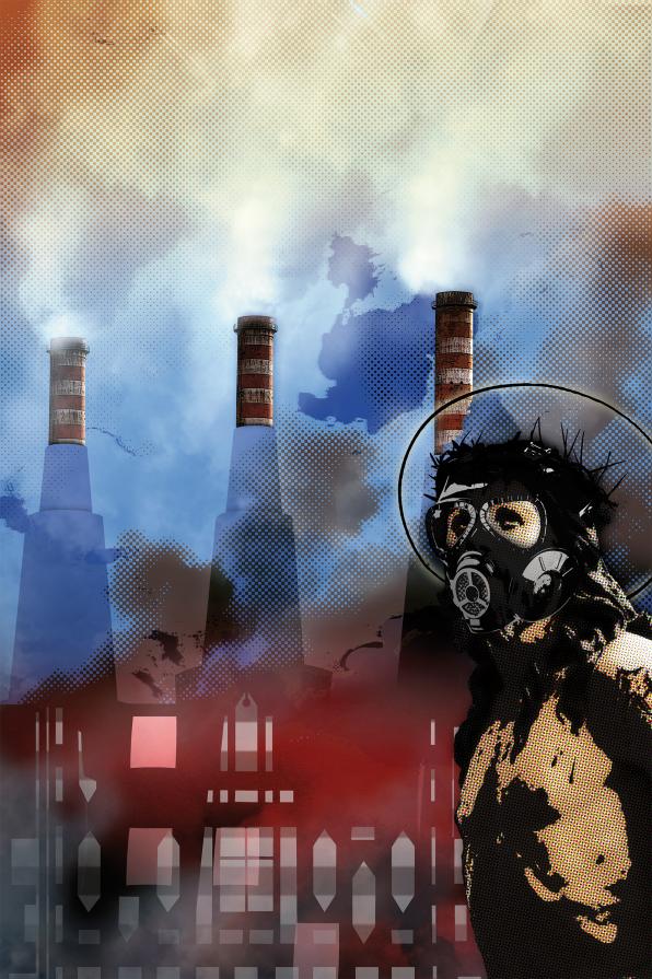 Acre air of sulfur, hot vapors, flames. This is the infinite hell of Taranto, the city that brings to stage the death and pain. Here all ask forgiveness of Christ with votes of bodily penance, but no mercy comes from God or from the men. The death has become an endless agony and Christ wears the antigas mask while prolonging his passion in this piece of "Paradise" transformed into "Hell" by the greed of few.