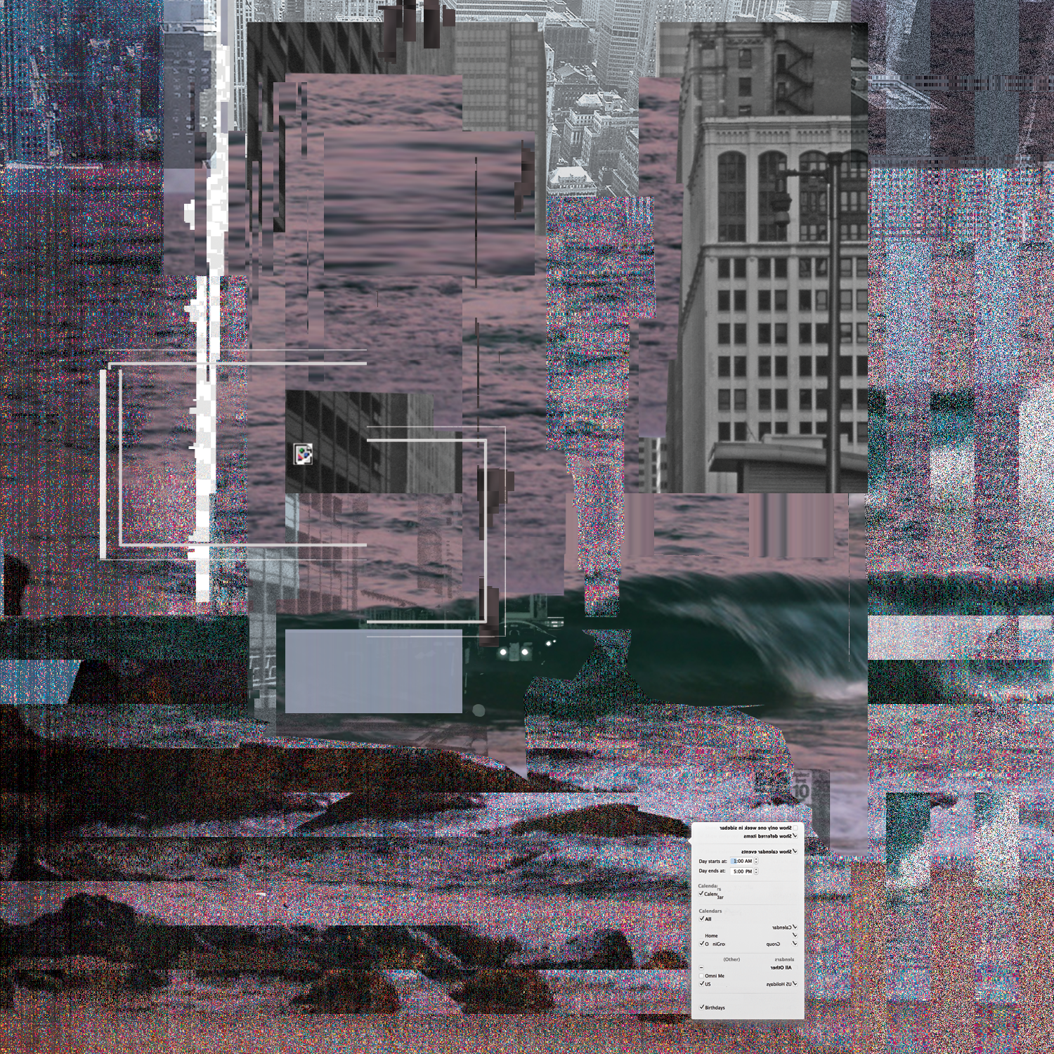This digital print is composed of layered photographs and digital iconography. The work is an investigation of sensory and digital mediation of the natural world. This piece explores the relationships between the world and the layers of mediation separating it from our experience, with a particular interest in time.