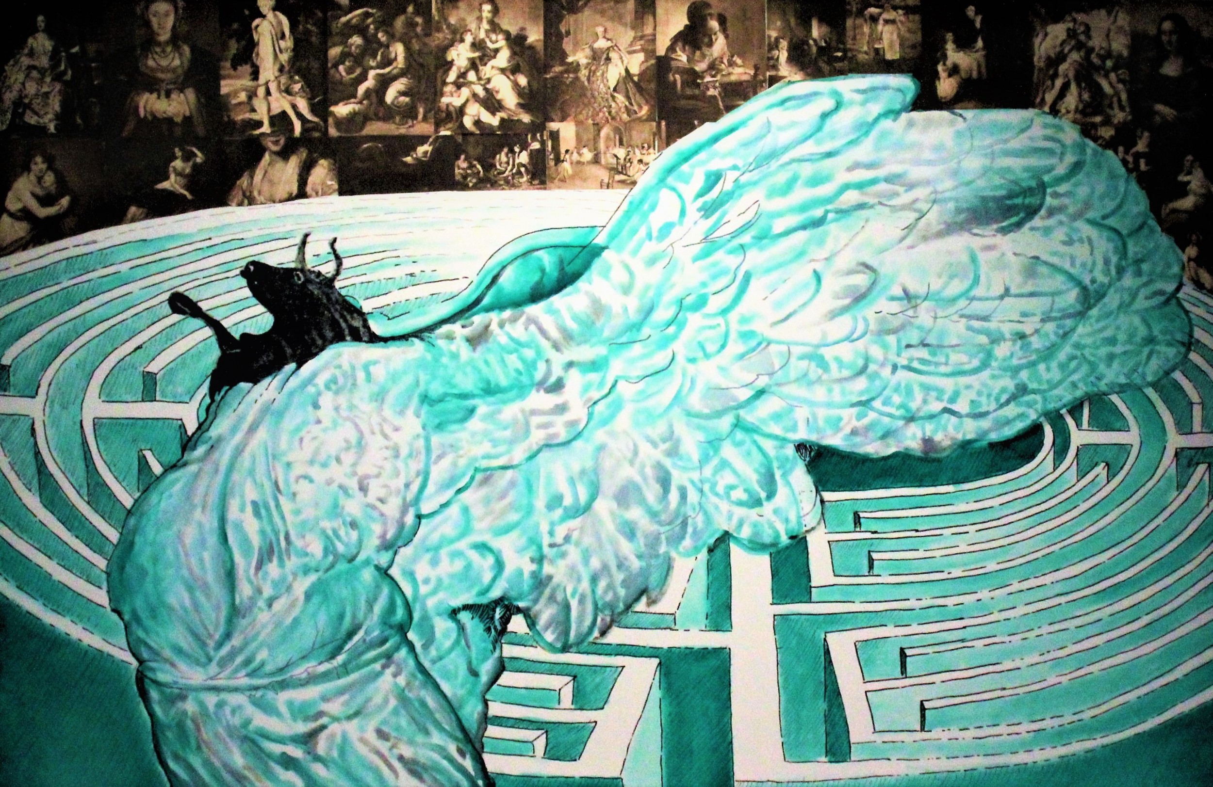 This work, is based on the ancient greek mythology of the minotaurus, Teseu, and the escape from the maze. Also builds on Ticiano´s painting Baco and Ariadne.