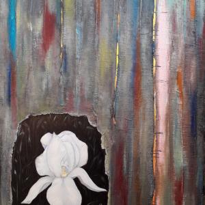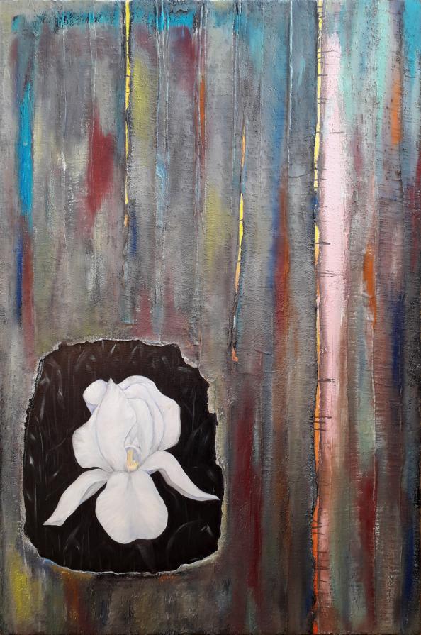 ... A flower, the Iris, pale, faded, mortified that rises up, illuminated by no one knows what strength or light, from a black background where the vegetation is hidden. Strait from the cement, lost in bright, dirty and artificial colors. Man, in his attempt to beautify and decorate his sick environment ... "HIS", no longer the real one of respected nature.