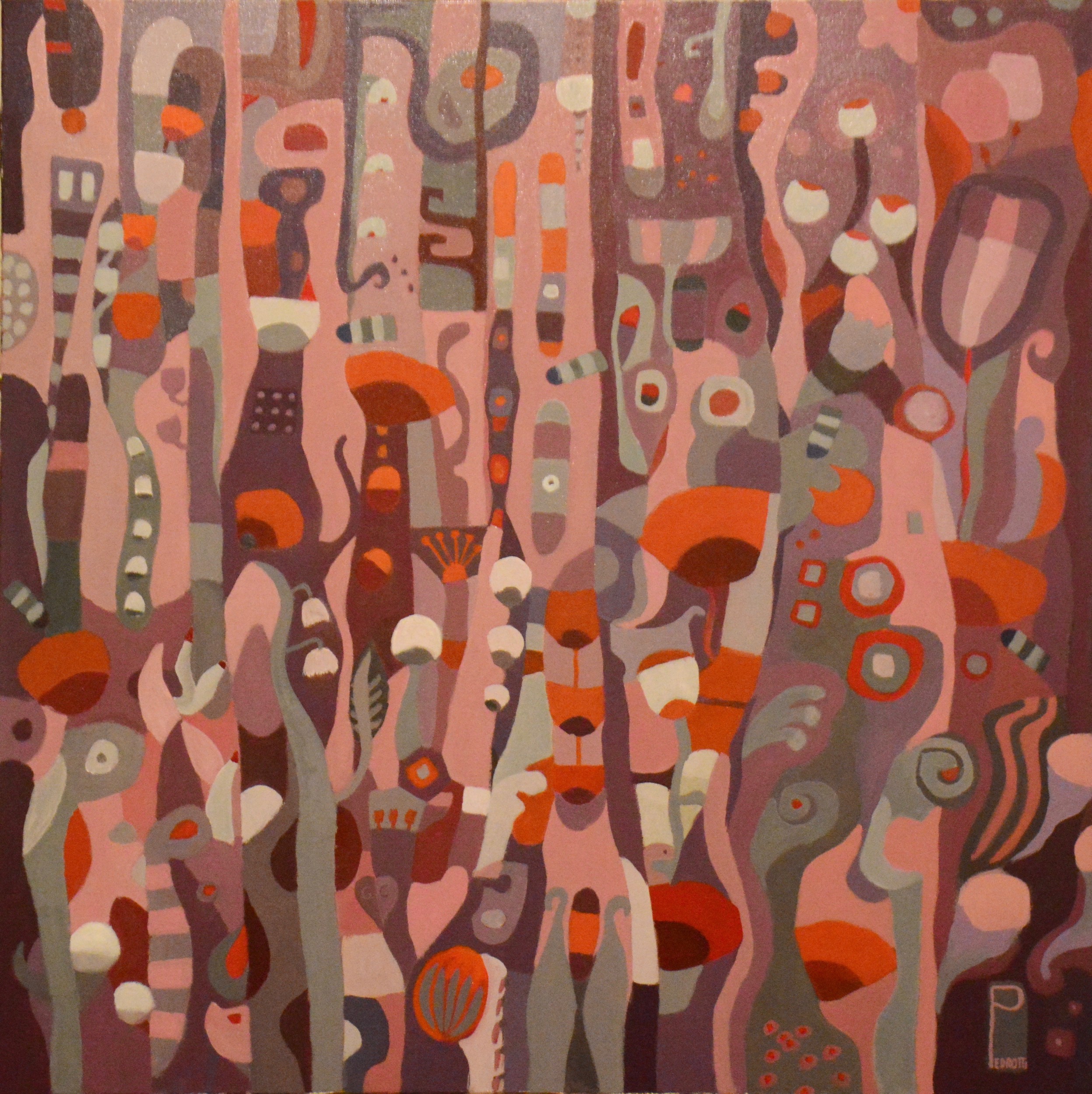 The density of blades of grass, flowers and stems that intersect and cross in a few square meters of crops is very high. The forms, made extremely elementary, are brought back onto the canvas in their continuous intersection.