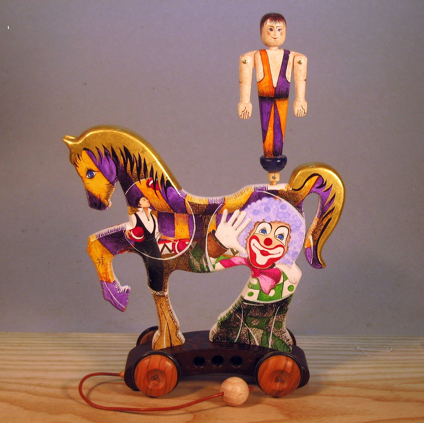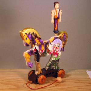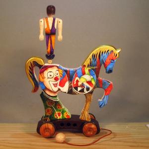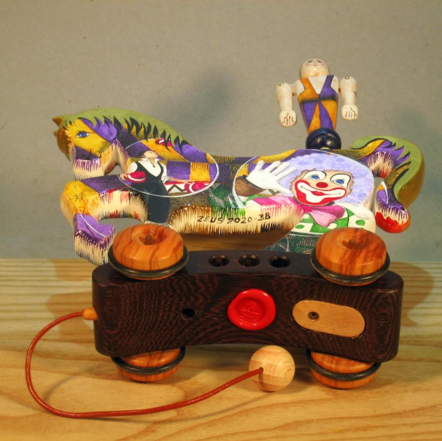 The horses of the Zeus line are made entirely of wood with manual processing and interpret the circus horse with its equilibrist. The work is mounted on a cart made of fine woods - during towing the juggler rotates and dynamically opens his arms, the horse is prepared for painting with a specific white background.