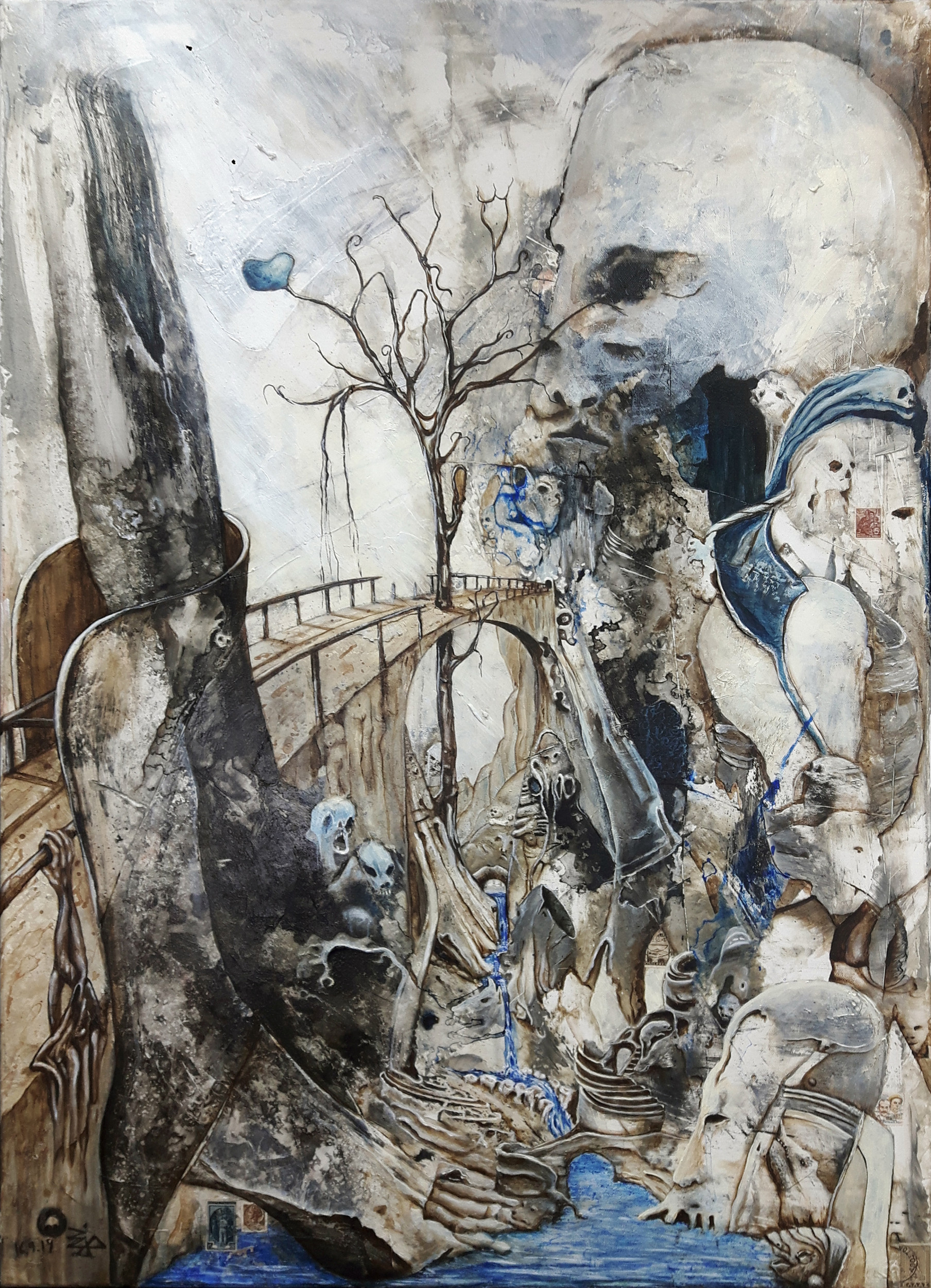 Every stream begins as a trickle. Comes from a source. Also the flow of life. At the foot of the world tree Yggdrasil, a vision takes its course. Yggdraisl, in mythology the pillar that supports the sky, breaks the bridge to the other world. Where does the bridge lead to? Who does it connect? What burden does she carry? The leg is rotting on the left bank. The shoe is too small. A hand clutches the railing for support. On the right side the grimaces show their faces. Can we build bridges, make connections? Or will the world tree break history in two?