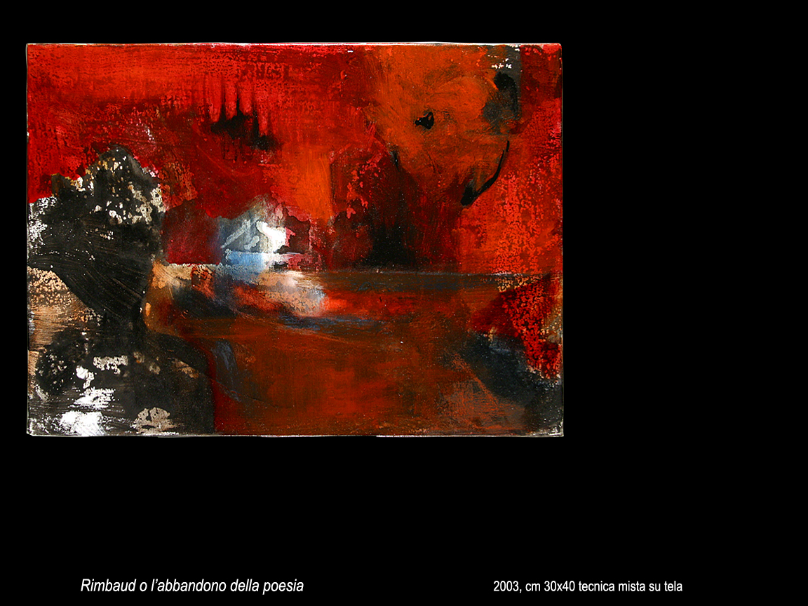 Rimbaud o l'abbandono della Poesia Painting, Fantasy / Visionary, Mixed technique, 40x30cm Canvas Mixed technique Added 15 years ago 3 I Like I don't like 1 Comment 98 Visits Share Facebook Twitter Google + Has been liked by 3 renato mericco Artist - Milano, Italy Tanya Bartolini Premium Artist - Milano, Italy Maurizio Carpanelli Artist - Bologna, Italy Comments 1 15 years ago Maurizio Carpanelli Artist Mi piace molto l'opera (questi rossi e neri sono un universo di passioni forti)anche se non colgo il nesso con la nota verbale .Bellissima! Say something You must login or Sign Up to write a comment Join