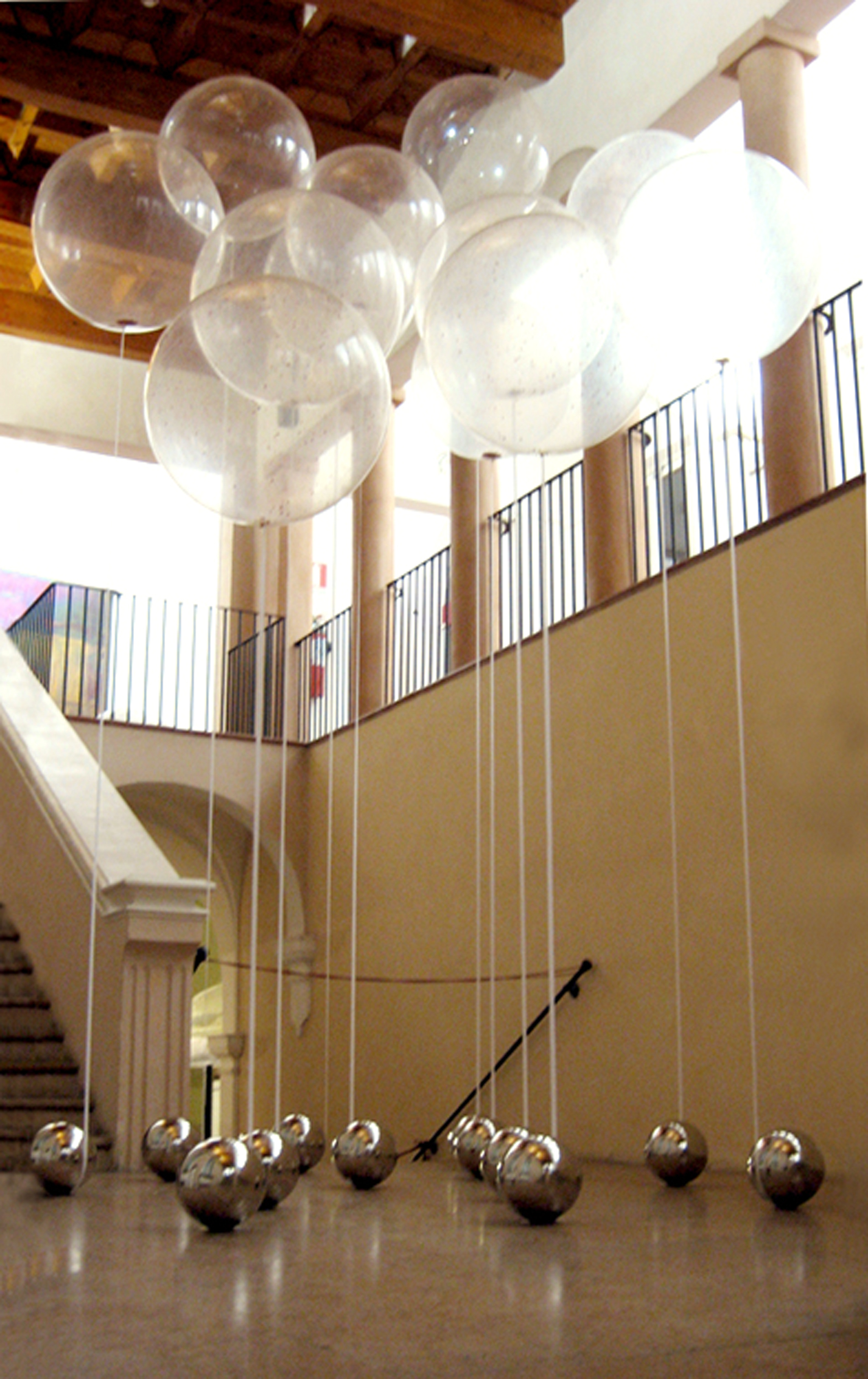 The mirror (used as a device by which to communicate with oneself) will be ‘crossed’ by the visitors, who will find themselves on the same level as the balloons, in a new space in which they are upside-down and thus led to reflect upon themselves.
