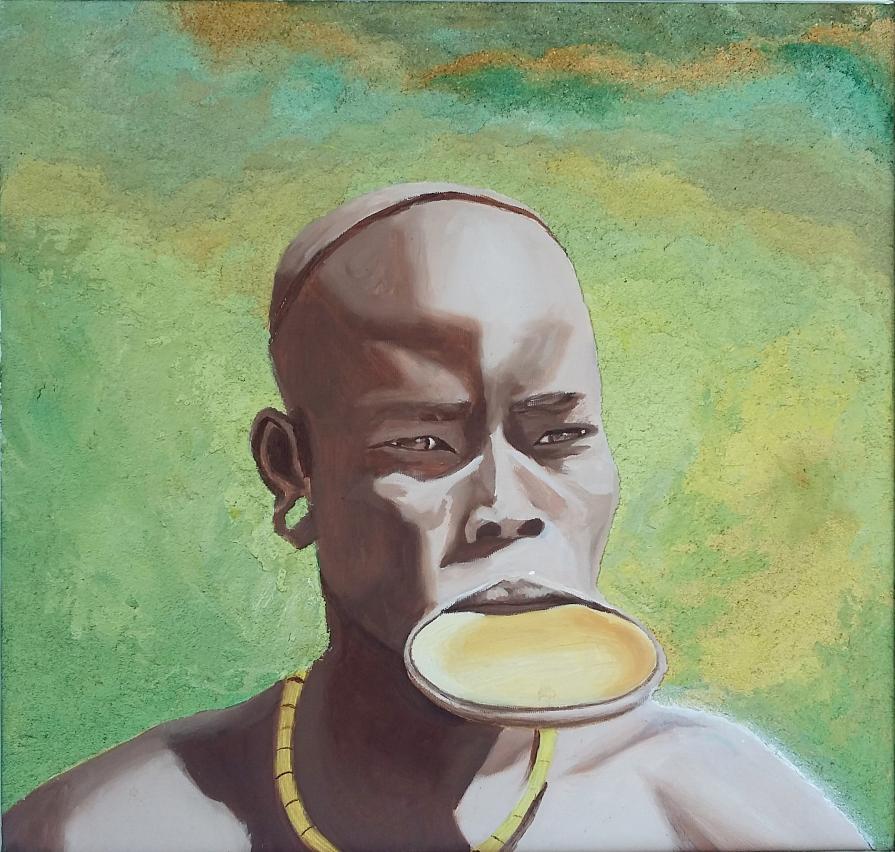 I painted this picture after seeing a documentary where men of a tribe in Africa had adopted the method to put the women a hard lip to make unattractive to prevent them from being raped by men of the enemy tribe. So the Title is: Violence that drives the violence. But she looks further, beyond the horizon, to look inside.