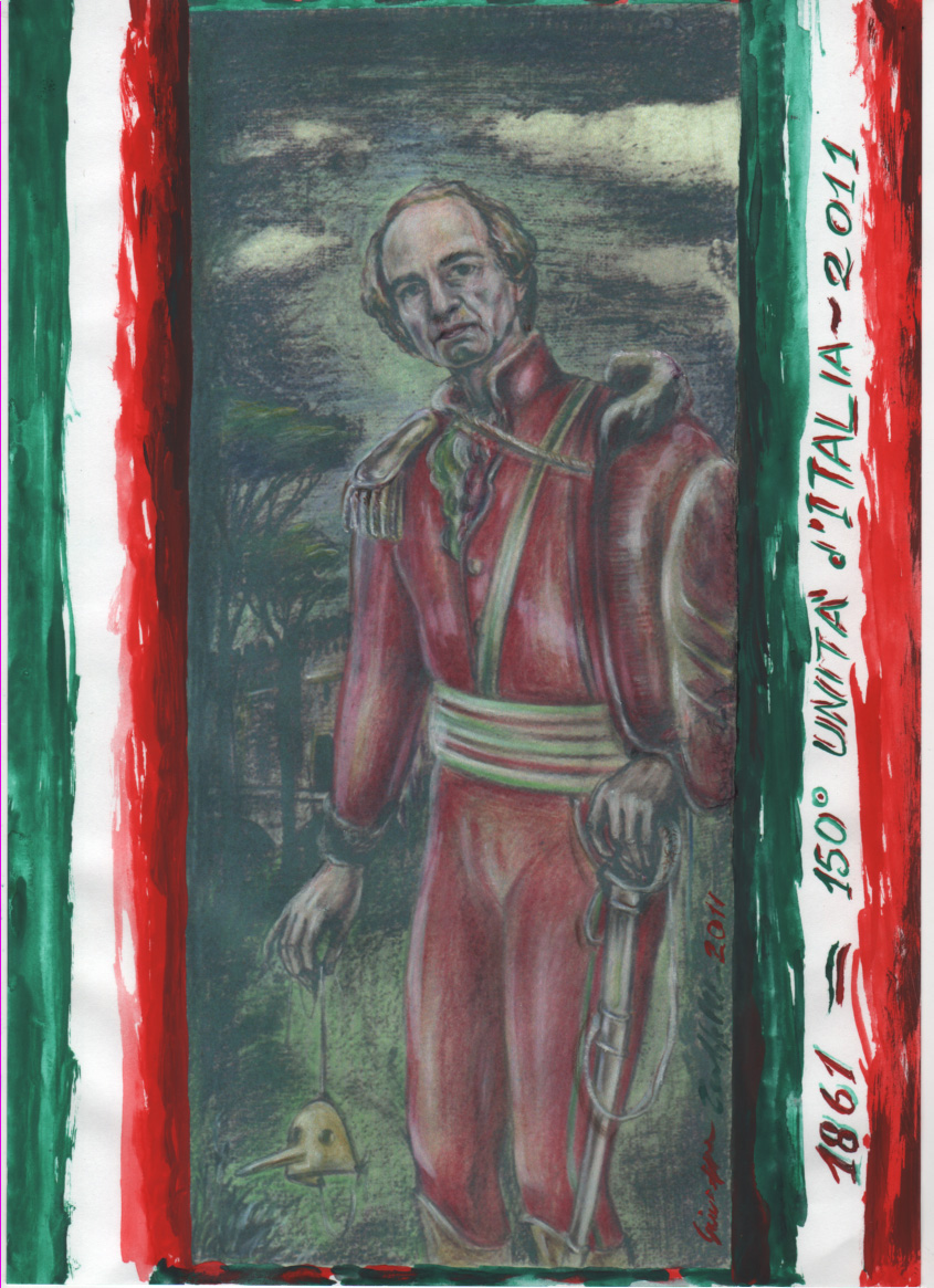 This is my tribute to the "Celebrating of the 150° Anniversary of the Unification of Italy, 1861 - 2011" and here I pretend to be a soldier of Garibaldi and the fiction is clearly revealed by the mask of 'Pinocchio' is holding with his right hend, which in popular memory means more than anything else, the 'li', but here in the dimension of art, fiction becomes noble. The word "celodurista" is an expression of members of the Northern League Party (party secession of northern Italy) to signify the cock - and that is they have the fucking very hard! - in the sense that they are real men, mainly strong, very determined, very will; in my work my intention is clear polemic against them: well we Italians have a cock hard, (and in this painting "this is seen"... in the fly of the trousers!