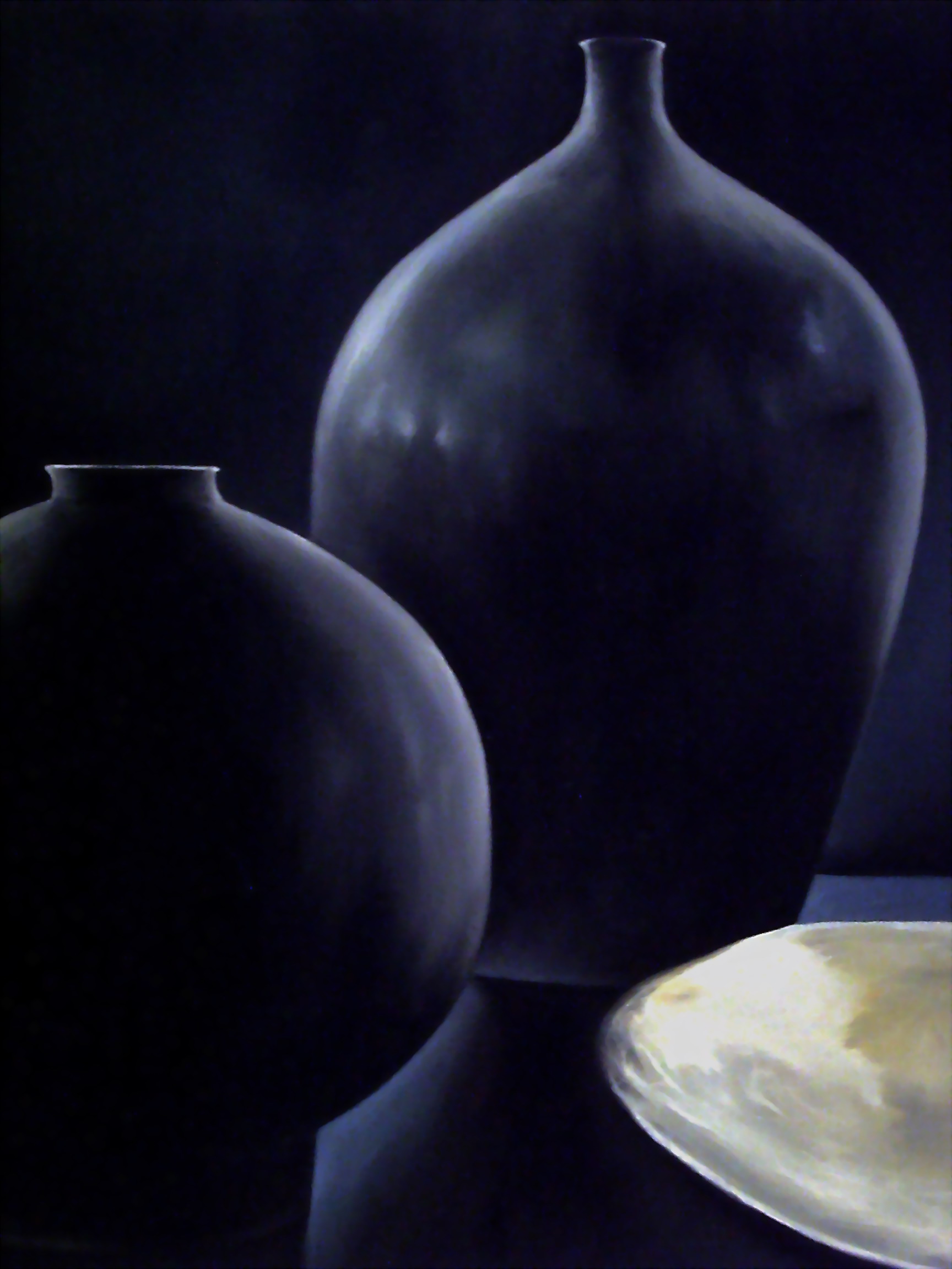 C'è una tradizione ,una eredità di appartenenza geografica ,qualcosa nell'aria della città che vivi : .Morandi era di Bologna .Quello che hai prodotto è un assoluto linguistico: i vasi sono ipertrofici,giganti blu ,fermati per sempre dalla tua pennellata in una fissità metafisica.Il blu straordinario è straripante,avvolge tutto,l'atmosfera e diluita in quel colore e il piatto sulla destra che è ,in questo caso ,sorgente di luce pura,modella in morbidi chiaroscuri le forme arcane immobili.Brava!!