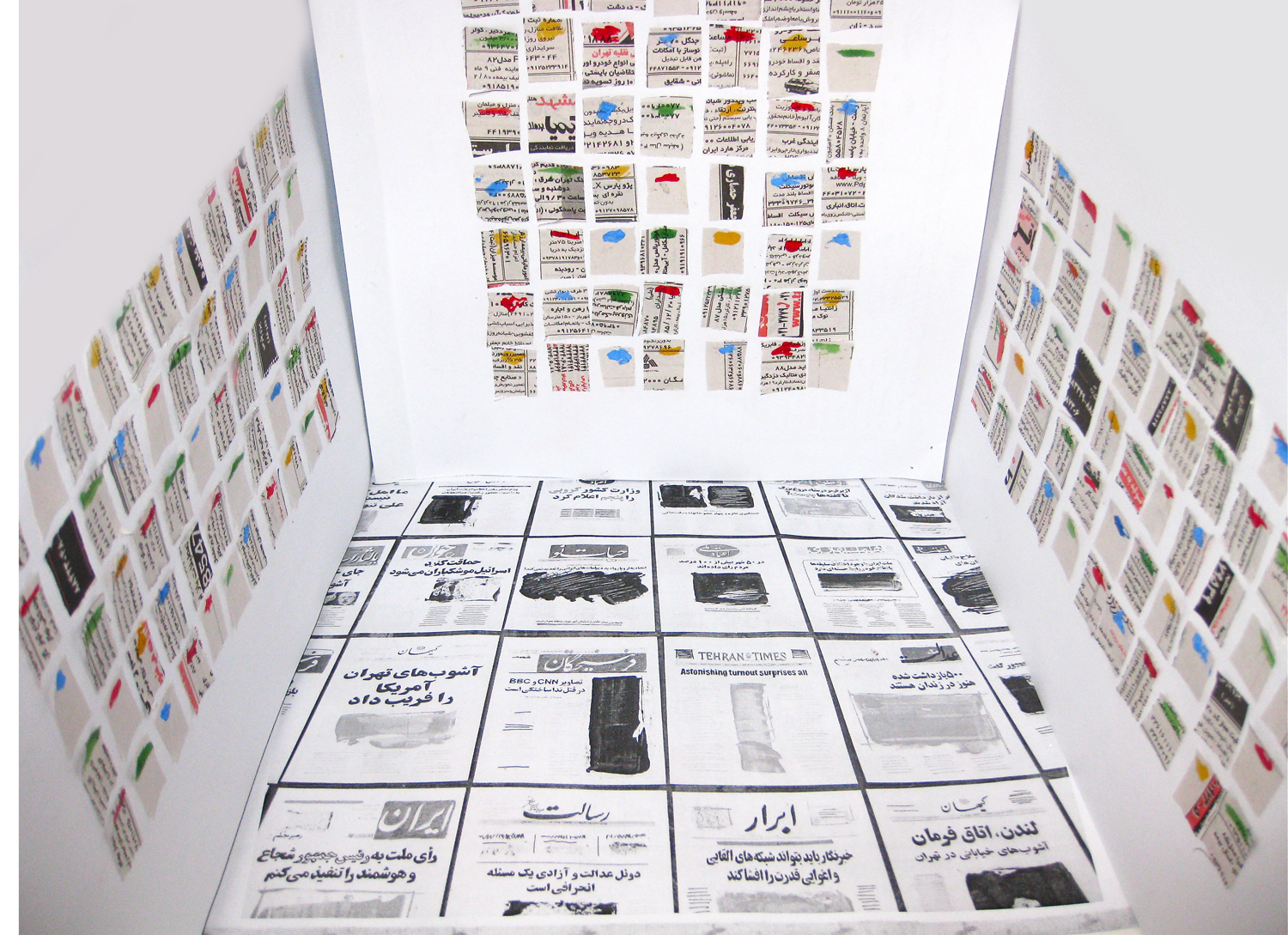 Mixed media:ink, pen, collage, acrylic, graphite, gouache. A4 size handmade replicas of newspapers to cover all 3 walls of the gallery space(56 newspaper on each wall).The floors will be covered in blown up prints of original newspapers stuck on the floor. The installation will cover the walls of the gallery with newspapers from Iran, each recreated by hand, yet copying the exact content. What happened in Iran after the green movement prompted me to do this series of works because there was no one left to report except our local newspapers which report mostly lies, demonstrating the extreme dictatorship and lack of freedom of speech in Iran. They are a proof of how the government insults its own people by telling lies. I am hoping to document current events in order to contribute, no matter how insignificantly, to bringing the world’s attention to the travesties and injustice happening in my country. Even if nothing comes out of it but awareness, then I have fulfilled my role as an artist and a messenger. The work opens a different window of perspective to that of mass media. The work teaches viewers the responsibility they carry for their society. It is above politics.
