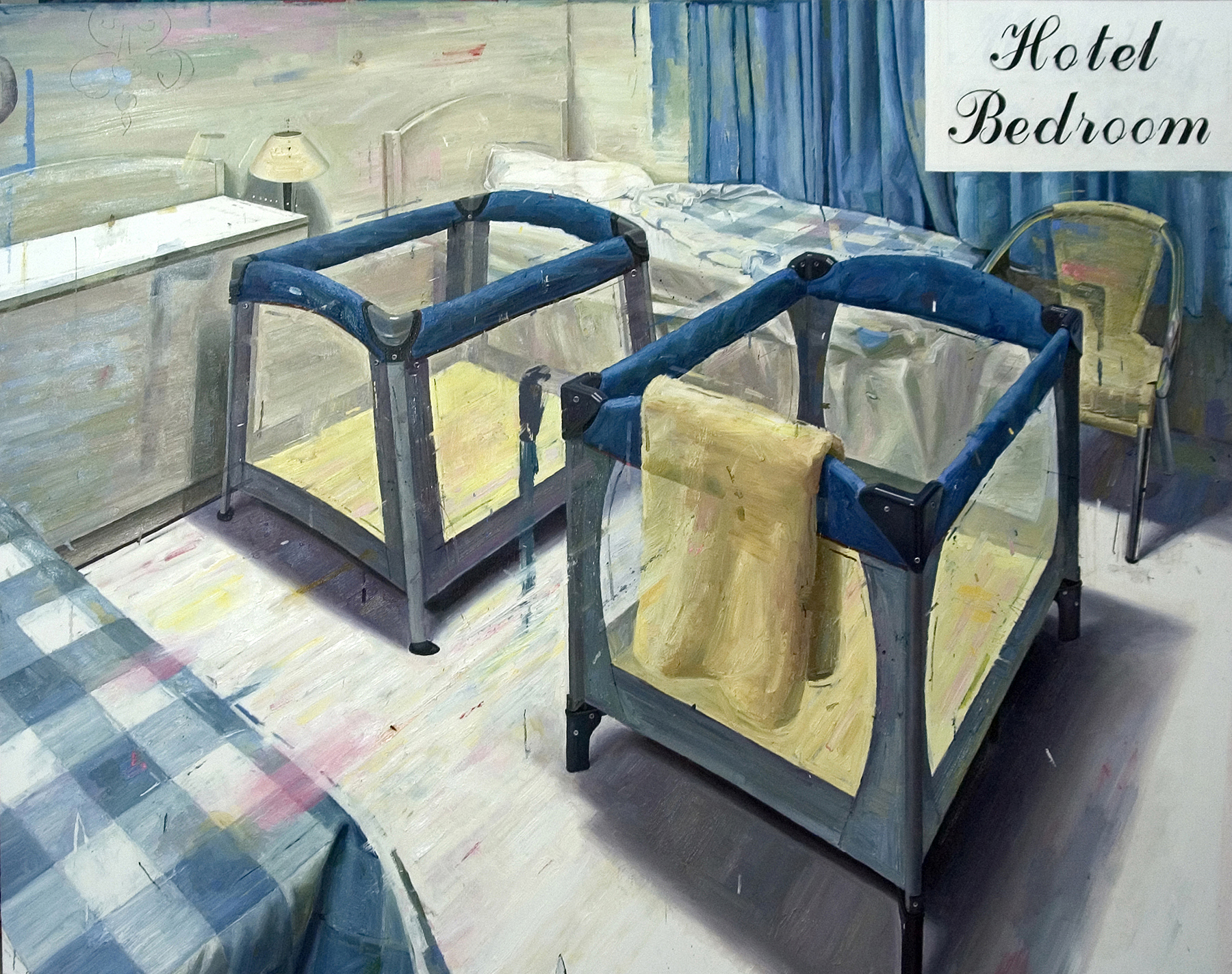 Hotel Bedroom is one of a series of works dealing with the subject of Tourism. Influenced by photography and film yet executed from life, the images in the series often focus on transition spaces like hotel bedrooms and lobbies, spaces designed to offer temporary insulation from the unforeseen and the unfamiliar, when man’s relationship with place has never been more fragile and temporary.