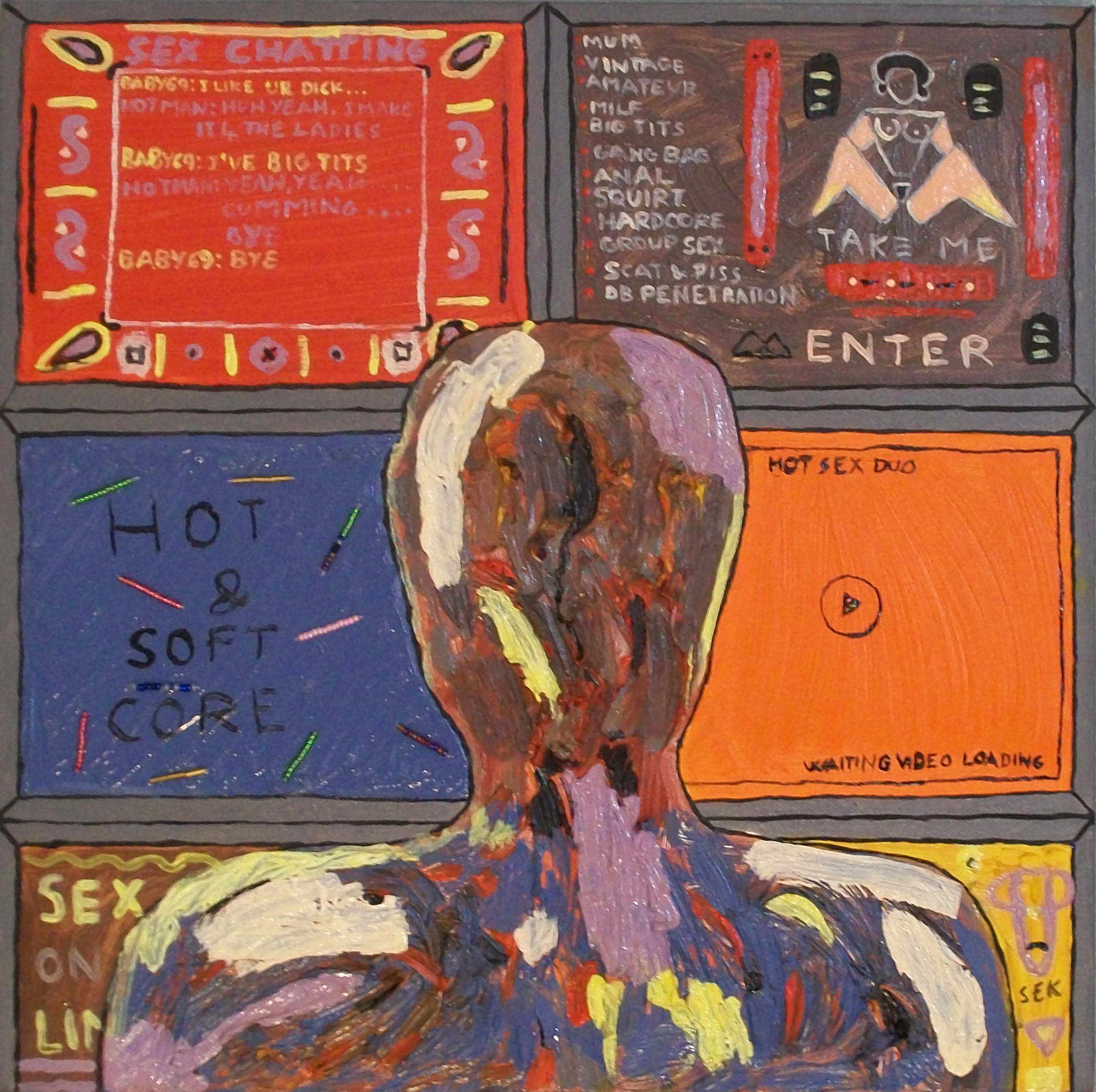 Cybersex - Many Possibilities is part of a collection composed by 12 painting called "Discovering Human Sexuality". In the painting a person looking porn websites in six screens.