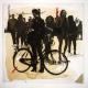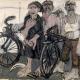 a group of four frightened workers supported by the handlebars of their bicycles.