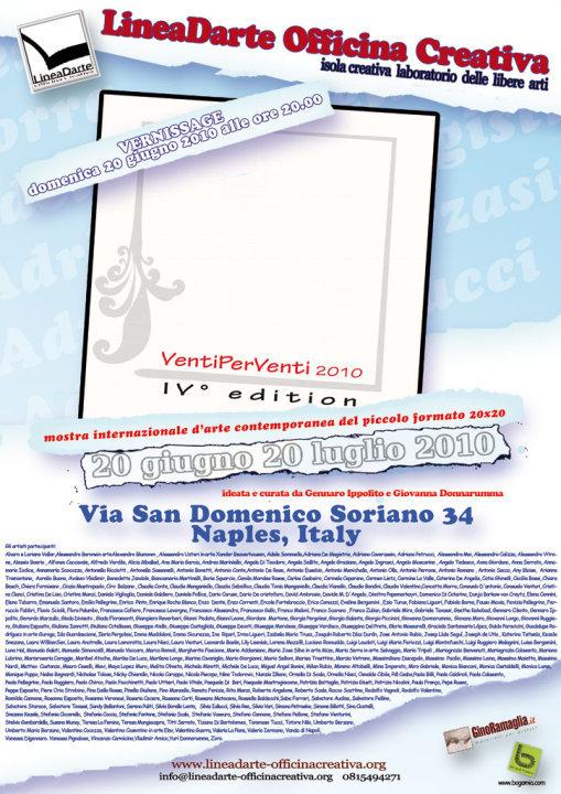 The festival now in its fourth edition is now fixed stage of fervent cultural summer Neapolitan LineaDarte island creative laboratory of liberal arts, "tank laboratory" as they like to remember the leaders of open space-is located in the heart of old Naples, viscera of Neapolitan popular culture. The event will host over 300 creatives from all over the world who will be protagonists of an artists' visual representation of where interesting works about 1000 and will involve lead us into an intriguing visual journey, made up of many poetic sensibility and expressive techniques and where real and tangible Art is the essence of these small works, the title of the event already indicate the measures of support, 20x20 cm, evanescence historic recall the old "Riggiòla" Neapolitan.