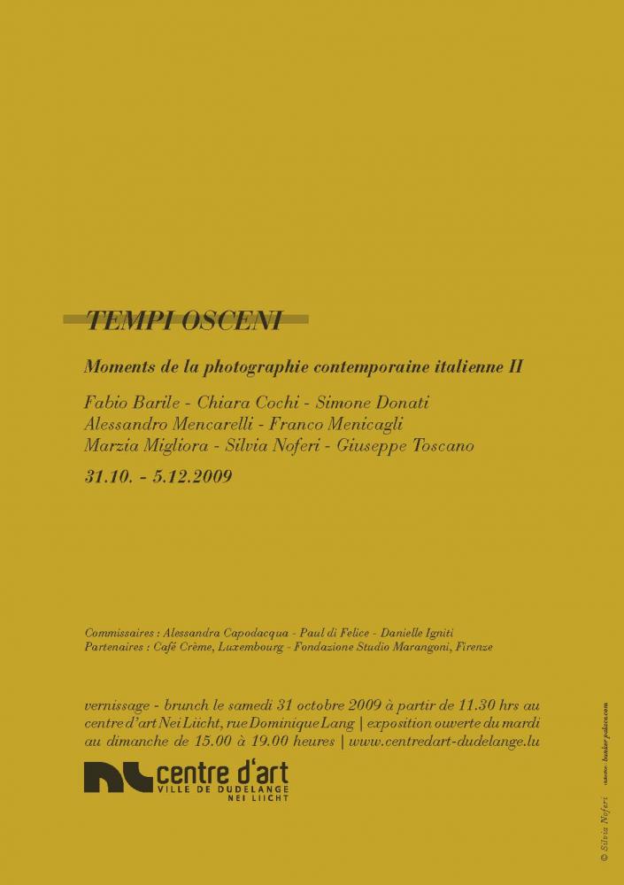 The link between these two exhibitions is to be be found in the articulation of a photographic thought process that joins big history to little stories, the public to the intimate, reality to fiction. This link is also reinforced by the title which uses the substantive "tempi" to create a play on words : tempi in scena for the 2001 exhibition and tempi osceni for the 2009 one. From an era when the artist was inspired by intimate setups, the changing of the private body into a public one, and the influence of media on daily life, we pass to an emerging generation whose new voices are making themselves quietly heard in Italy. The artists try to resist the "obscenity" (in a figurative sense) of the current Italian situation by denouncing the triviality, indecence and bad taste of political representatives through their politically committed photographs and videos, which are sometimes off-kilter.