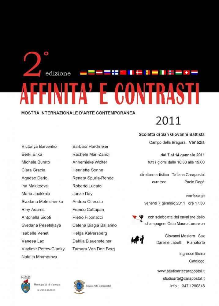 After the successful first edition STUDIO ART CARAPOSTOL organizes the 2nd edition of "Affinità e Contrasti", International Exhibition of Contemporary Art 7 to 14 January 2011 which will be attended by representatives from 29 artists from Spain, France, Holland, Switzerland, Austria, Norway, Italy, Finland, Hungary, Moldova, Russia, Lituania, Germany,Denmark and China in the new exhibition space of the Scoletta of St. John the Baptist. The building adjoining the church of the ninth century that overlooks the field of Bragora (also known as Campo Bandiera e Moro), in the city center in the Castello district between Piazza San Marco (10 minutes) and the Biennale Gardens. The Scoletta returned to its original use for the promotion of the arts in the last Biennial was established in the halls of Serbia and Macao, and now offers the Venetian artistic scene and established artists nationally and internationally.