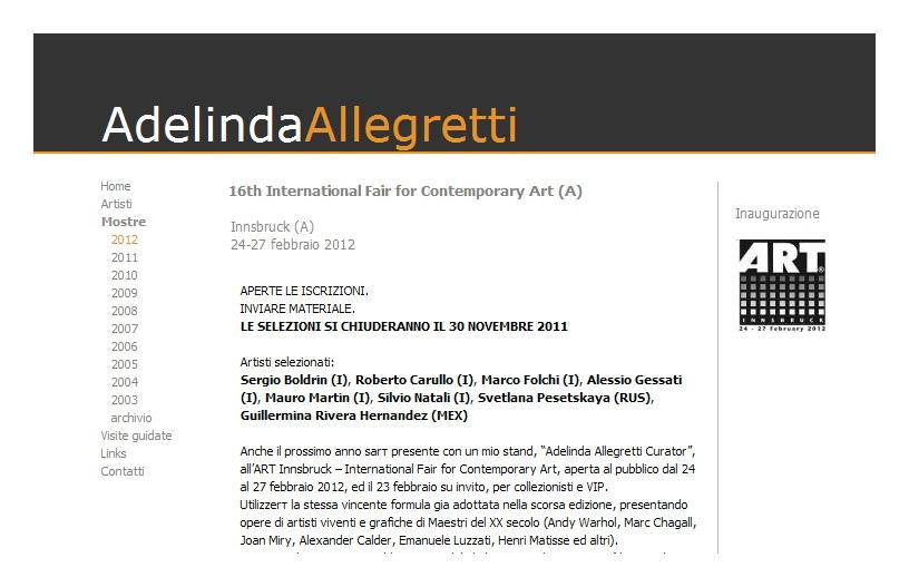 Anche il prossimo anno sarò presente con un mio stand, “Adelinda Allegretti Curator”, all’ART Innsbruck – International Fair for Contemporary Art, aperta al pubblico dal 24 al 27 febbraio 2012, ed il 23 febbraio su invito, per collezionisti e VIP.