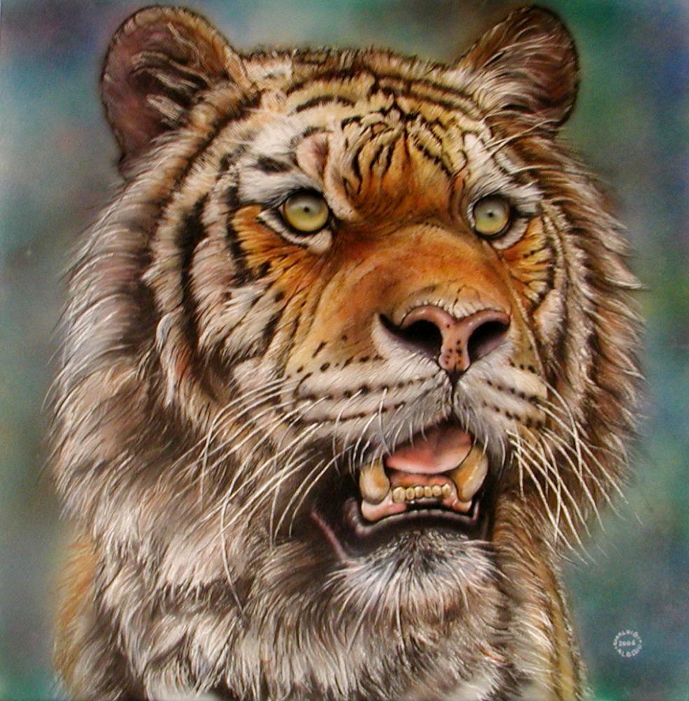 Una tigre ha le fauci spalancate, non è necessario sapere il perché, lo si immagina.