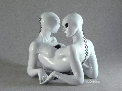 In Niba sculptures, there is only the form of the female body, kept inside close-fitting latex clothings. The reflection gets real through the symmetrical game of duplication, celebrating the fleeting aspect of appearing.