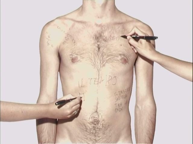 In his video Armando Fanelli outlines an emotional map, where the great complexity of human relationships can be perceived throughout the porous border of the skin,.It's a process which continues in the photos, where what's usually hidden is overbearingly showed off.