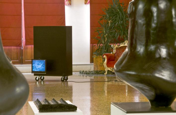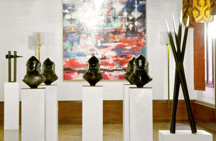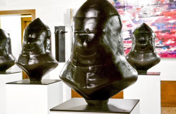 A formation of black helmets with archaic and indecipherable smiles reveal the eternal return, the continuous renewal of ancient dimensions of power between dominator and dominated, subject and subjected. Their dense black colour seems to absorb all - history and time, past and present - while perhaps representing a tragic point of saturation. Could that enigmatic expression, seemingly unfathomable, become the sign of an awareness, of a resistance, or of an imminent breaking of the ranks? B[e]d Time is connected to this same reflexive dimension. It is a bed/sculpture which, through the ironic impossibility of action, becomes a metaphoric couch of torture of thought. - Laura Poletto