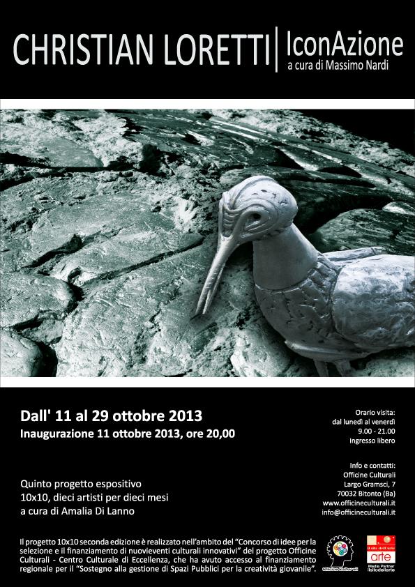 As part of the cultural project 10 × 10 , ten artists for ten months , reformulated in the second edition by Amalia Di Lanno , will be inaugurated on October 11 , 2013 at 20:00 in the exhibition hall of the Laboratory of Urban Cultural Workshops Bitonto (Ba) shows the the sculptor Christian Foggia Loretti