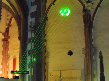 L’ambiente assume quindi l’aspetto di una grande cassa di risonanza, le lunghe corde dello strumento luminoso, tirate nello spazio architettonico, emettono delicati suoni che ispirano stupore, creando una soave Armonia delle Sfere che immerge il luogo in un’atmosfera meditativa e di contemplazione, dove il tempo perde la propria connotazione di successione ininterrotta di attimi, per riportare tutto ad una dimensione di magica sospensione.