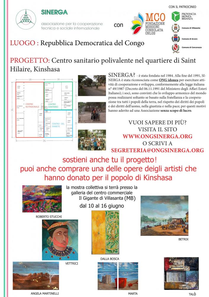 the ONG SInerga (Association for Technical and social cooperation international, based in Monza), implementing aid programmes for about 30 years in 5 African countries, in collaboration with the Fondazione della Consolata Missions of Turin, held a painting exhibition aimed at raising funds for the project for construction of a health centre in the District of Saint Hilaire in Kinshasa (Democratic Republic of the Congo); This Centre consists of: dispensary, children's Medical Center for treatment of diabetes.The initiative, which will be held in the Gallery of the Mall, got the patronage of the province of Monza and Brianza, in the municipality of Villasanta, of the municipality of Arcore and the municipality of Concorezzo. Among the artists invited to participate with their works at the event, will also present the artists valtellinesi Angela Martinelli, Antonella Della Bosca and Clelia Vettrico and Betrix , Roberto Stucchi and Raffaello Talò.The exhibition aims to introduce the project undertaken and to raise funds through the sale of the works of the participating artists.The presentation will be available on the website of Jeremy Horn in order to ensure maximum transparency in the management of donations
