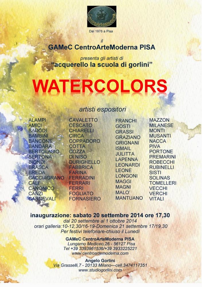Si inaugura Sabato 20 Settembre 2014 alle ore 17,30 presso gli spazi espositivi della Galleria d'Arte Moderna e Contemporanea CentroArteModerna di Pisa, a cura di Massimiliano Sbrana, sul Lungarno Mediceo al n.26, la mostra internazionale di acquarelli "WATERCOLORS" promossa da "Acquarello la Scuola di Gorlini".