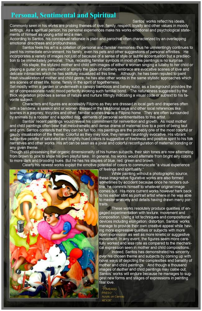 Santos’ sincerity and earnestness to his own conviction makes him a distinct artist in this genre. His idea is to advance his own surface and vamp up new approaches to a much articulated theme and perhaps many would agree that he ably did so. His images have become warmly recognizable in many ways apart from his colleagues.