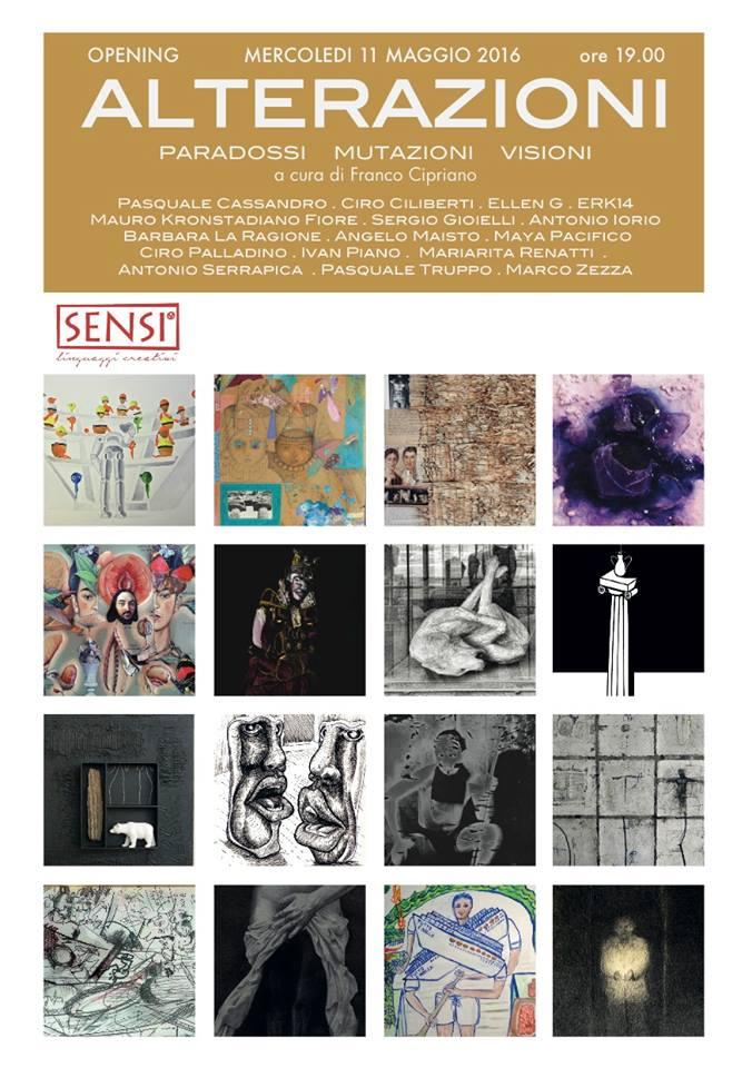 ALTERAZIONI paradossi mutazioni visioni presenta sedici artisti attivi nella complessità culturale e sociale dei territori campani. Nelle opere di Pasquale Cassandro, Ciro Ciliberti, Ellen G., ERK14, Mauro Kronstadiano Fiore, Sergio Gioielli, Antonio Iorio, Barbara La Ragione, Angelo Maisto, Maya Pacifico, Ciro Palladino, Ivan Piano, Mariarita Renatti, Antonio Serrapica e Marco Zezza si riflette, nelle sue contrastanti declinazioni, la proliferazione espressiva che come memoria ibrida forma la stratificazione immaginaria dell’esistente. L’immaginazione memoriale, che nasce nel presente, si muove oltre le coordinate cronologiche, interagisce ‘liberamente’ con la “materia del senso”, coagulando sensazioni, trasmutando corpi, fondendo storie, coniugando l’inconciliabile. Disegni, collages, fotografie, pitture, assemblages, le opere di ALTERAZIONI, espongono la loro obliqua seduzione, quando interrogano lo spectator attraverso il loro eccedente tradimento dell’“estetica formale”.