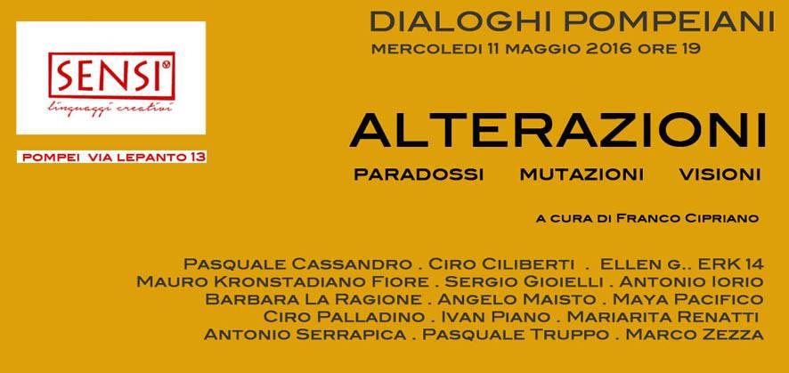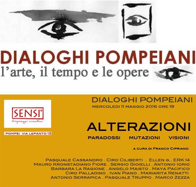 Continua a Pompei allo Spazio SENSI - linguaggi creativi, con la mostra ALTERAZIONI paradossi mutazioni visioni, il ciclo espositivo nell’ambito del progetto DIALOGHI POMPEIANI l’arte, il tempo e le opere. A cura di Franco Cipriano, il progetto-evento promosso da Spazio SENSI - linguaggi creativi, propone una riflessione sul crocevia estetico, storico e critico del rapporto tra forme della memoria del classico e linguaggi contemporanei. È coordinato da Giuseppe Scagliarini con la collaborazione alla comunicazione di Raffaella Barbato e Francesco Domenico D’Auria.