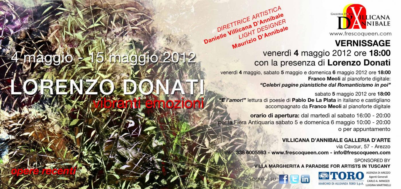 Friday, May 4, 2012, at 6PM, the Villicana D’Annibale Galleria D’Arte of via Cavour (Arezzo) is pleased to announce the inauguration of the exhibit of painting of Lorenzo Donati, entitled Vibrant emotions. The exposition, curated by Californian gallerist Danielle Villicana, will include a selection of 21 works of art by the Aretine artist with origins from Canada and Italy. The solo exhibition will continue, at free entry, until Tuesday, May 15, 2012.