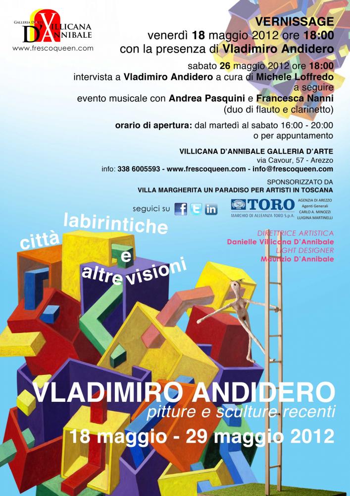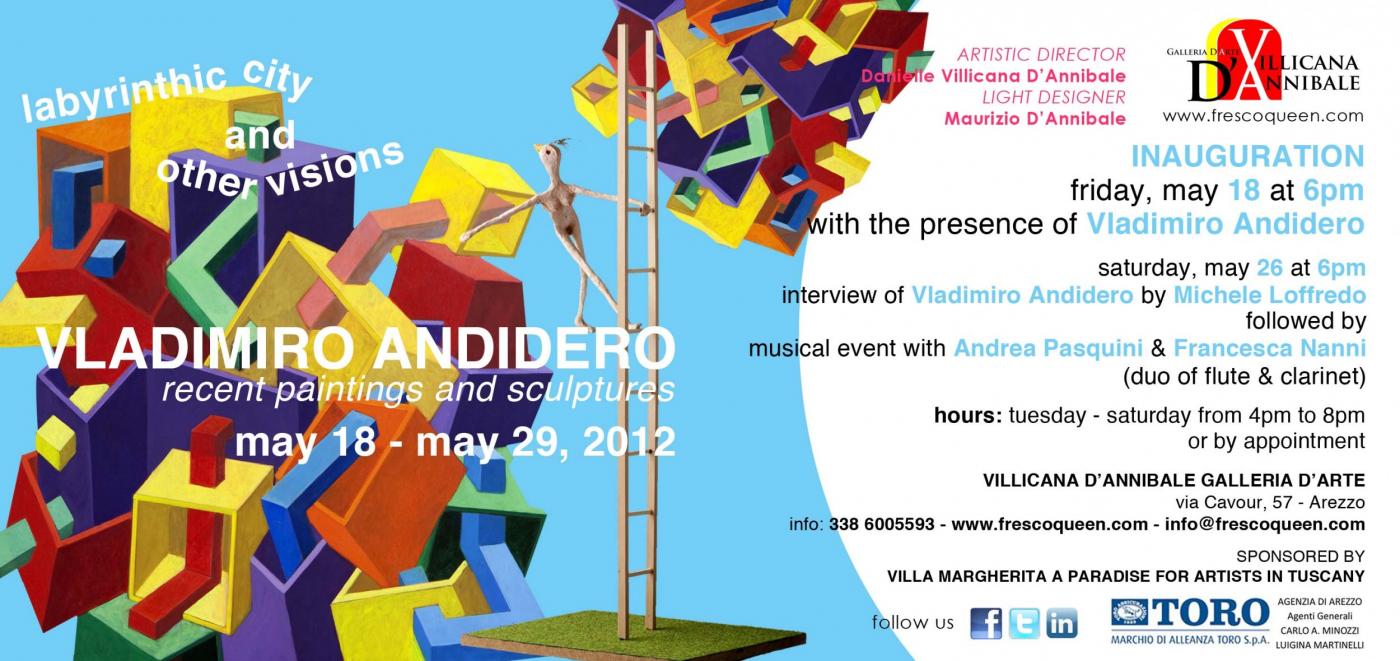 Friday, May 18, 2012, at 6:00pm, at the Villicana D’Annibale Galleria D’Arte of via Cavour (Arezzo) will inaugurate the exhibit of painting and sculpture of Vladimiro Andidero entitled Labyrinth Cities and Other Visions. The exposition, curated by Californian gallerist and artist Danielle Villicana, will include a selection of sixteen works of art – ten canvases and six sculptures - by Calabrian artist who lives and works on Arezzo. The solo exhibition will continue, free admission, until Tuesday, May 29, 2012.