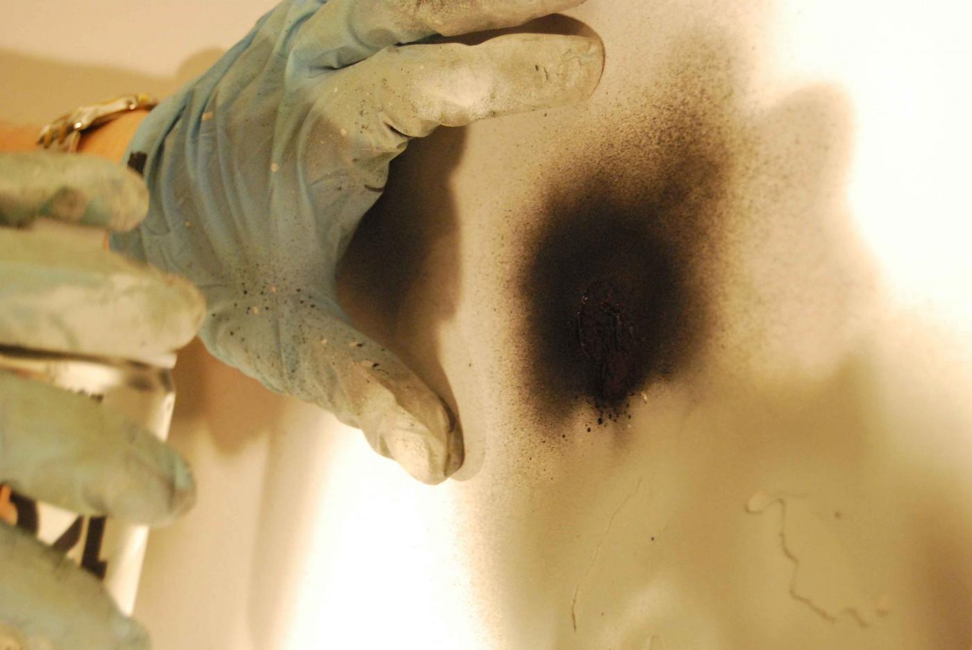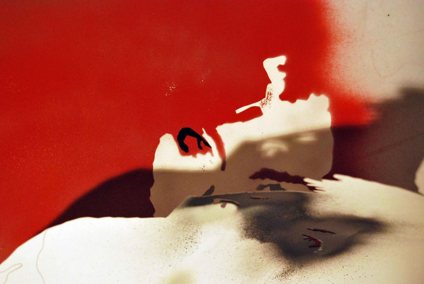 The creation of the work is divided into several stages: the initial image is digitally broken down into a collage of elements, patches of primary colors that will be used to make the stencil, cut by hand on paper. Each template is associated with a specific color and to a progressive order of use. The artist proceeds to spray with the airbrush acrylic paint with water or synthetic areas cut from stencil masks composed in secession of layers of color work.
