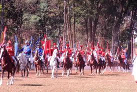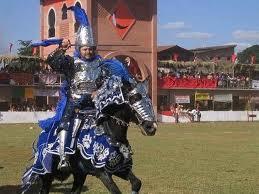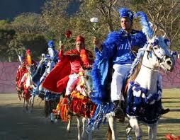 The hierarchy of the armies of Cavalhadas follows, both for Christians and for the Moors, the following order of twelve knights, have the highest rank in the King, below this we have the Ambassador and tracking down the ten remaining riders. The last knight of rank will rise only if death or withdrawal of any other up, so does the Ambassador, that only will become King if the King himself die or quit. After the two armies met, they follow in line of command, with the King forward to the house of a citizen who offered to give them a courtesy and respect, the morning breakfast, called "Farofa." This coming and going of knights riding through the streets, the Christian knights can not meet with the Moors, unless at the time of Farofa and later in the trial. In Farofa is served coffee, biscuits, juices, soft drinks, alcoholic beverages and "Farofa" itself, derived from the ancient delicacy troops who leaked the interior, made of cassava flour and dried meats. Riders on this occasion, pray together and dance the Catira, a folk dance where you line up facing each other and the 24 riders, packed by guitars, tambourines and songs, clapping their hands and feet in rhythm and cadence typical. After the thanksgiving, which is made in the form of chants, the home owner who offered Farofa depart for the field test.