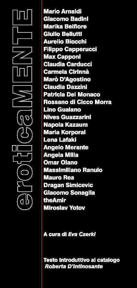 Participating artists: Mario Arnaldi - James Badini - Marika Belfiori - Julius Bellutti - Aurelio Biocchi - Philip Capperucci - Max Capponi - Claudia Carducci - Carmela Cirinnà - Marò D'Agostino - Claudia Dazzini - Patricia Del Monaco - Rossano Di Cicco Morra - Lino Gualano - Nives Guazzarini - Napola Kazaum - Maria Korporal - Lena Lafaki - Merante Angelo - Angela Milia - Omar Olano - Massimiliano Ranuio - Mauro Rea - Dragan Simicevic - James Sonaglia - theAmir - Miroslav Yotov.