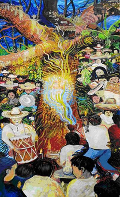 Day of the Dead is a feast to Cupilco , the day when the dead come down from heaven to meet with the family , eat dinner with them , be updated on events that have affected the community and maybe give practical advice . A feast , a feast . A Cupilco not profess to finalisms , simply switches the existence between earth and heaven thanks to the service of the winged god of wind Eh- écatl . Eliazar Hernandez Arias born and work in the village of Tamulté de las Sabanas , near Cupilco , in southern Mexico . There, where the high and low melt, Eliazar discovered the art of painting , first comales ( earthenware dishes ), then tele , so big walls , even the huge water tank of the state capital of Tabasco , Villahermosa. There he learns the language of magic realism , not the twentieth century , metaphysical , played in Europe , such as the return to order but that of the pre-Hispanic tradition , prophetic and wisdom through knowledge . Suspended between myth and faith , his work is nourished by collective memory , reworks the aesthetic credo of civil and an industrious people and updated. It gives life, under the critical eye of senior citizens, murals narrative of facts not great but felt and participated , such as the construction of a bridge or a temple to the Virgin. In the works on canvas prevails suggestion folkloric characterized by strong sign , sinuously Baroque and bright colors. There are naturalistic and decorative corn fields and platanales , but religious themes predominate : a Golgotha between the banana plantations and the Gulf of Mexico in the background , a visionary image of the Father on a log gigantic ceiba , a procession of farmers who raise their torches votive , a Virgin with wreaths of glare and heat radiation that seem mystical fireworks. In the Day of the Dead , November 2 , the truest manifestation of Mexico deep, in a UNESCO intangible heritage of humanity, Eliazar is contributing artwork and participates in the construction of the altar of marigolds , before taking the flight to Milan and oversee the staging of the show, in particular the installation of an " altar de muertos " , the small family buildings , made of fruit , corn, flowers, wood , tortillas and tamales , aguardiente and pozol and attend the inauguration of 5 November. A Massimo De Giuseppe , a historian of Mexico, go our thanks for the creation of the event, the catalog text that outlines the historical background of the region of Tabasco , the Delivery takes about twenty of acrylic displays . Alessia Locatelli deserve our thanks and the merit of being measured critically with an expression of ethnic art and unusual for its " strings" of contemporary historical and Eurocentric .