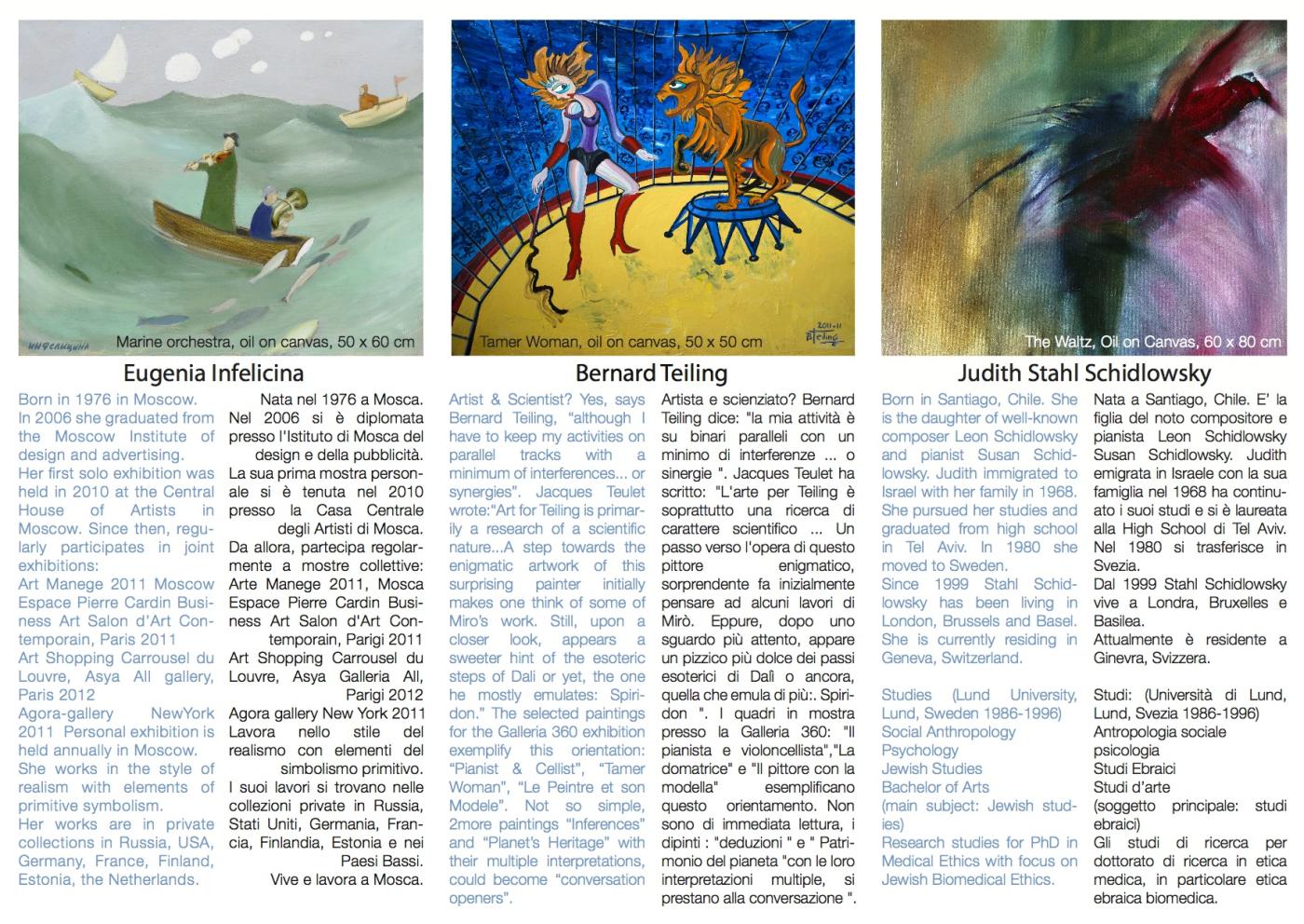 The artists whose works are exposed, though differing from each other through their individual styles and origins, look towards artists from the past. Eugenia Infelicina is an example. Her works remain half-way between strong permanent ties with the past and a strong will to open up towards the future.