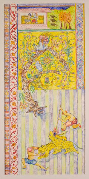 Sachin Melwani was born in 1976 in India and currently lives and works in London. Educated at the prestigious Central Saint Martin's School of Art and Design his work is visibly influenced by surrealist imagery and post-impressionist colour theory. Opening on 1st November 2012 at the Arch402 Gallery in Hoxton, Sachin's show features the artist’s innovative blending of western academia theory with eastern imagery on painting to produce highly desirable and detailed works.