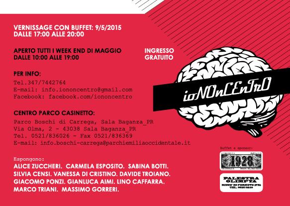 IoNOnCEnTro vol.2, Event Of Art Collective comes in its second edition, this time in collaboration with the Parks Del Ducato, the exhibition will be staged at Casinetto via Olma 2 in Sala Baganza within Boschi Di Carrega, exhibit 11 artists who look to the art 360 ° passing through painting, sculpture, photography and graphics specifically: Alice Sugars painting - painting Carmela Esposito -Sabina Botti painting - Silvia Censi photography - Vanessa Di Cristino graphics - David Troiano photography Giacomo Ponzi-sculpture - Gianluca Aimi painting - Lino Caffara photography - Marco Triani painting - Massimo Gorreri photography.