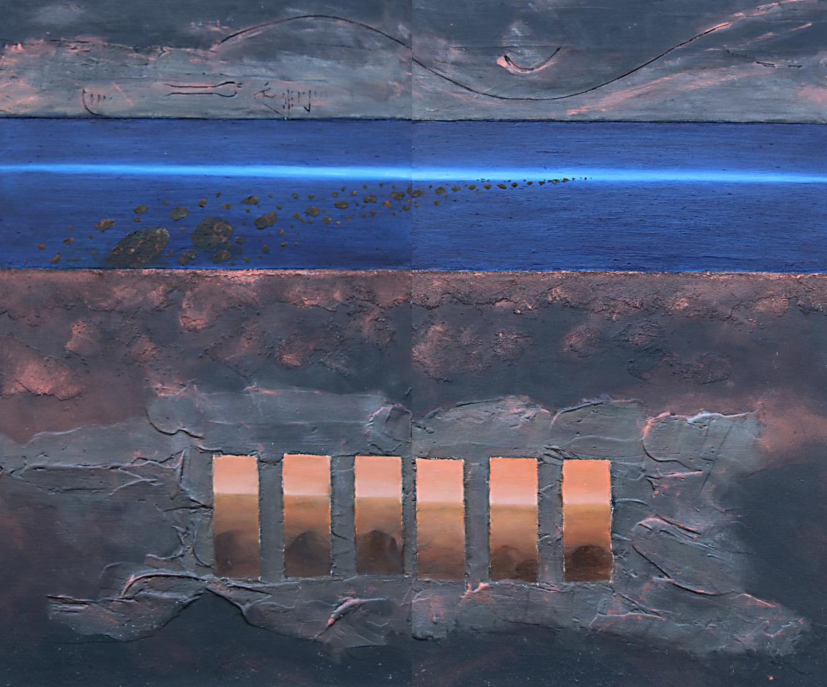 For Maurizio Finger codes are the stars of a story is as much in memory as Space, signs proceeding from the abysmal distances and glide toward the work, introverted and extroverted extension, smooth surface, deep and irregular, like a planet yet unknown yet so familiar, full of ruts, ravines, ruins and dry oceans. So, geometries and materials overlap, between earthy colors and depth opalescent, heightening the visual and tactile density of the board, as symbols which, for us, recall precise meanings but which, on the side opposite of the Universe, some may interpret and remember who knows what other reasons.