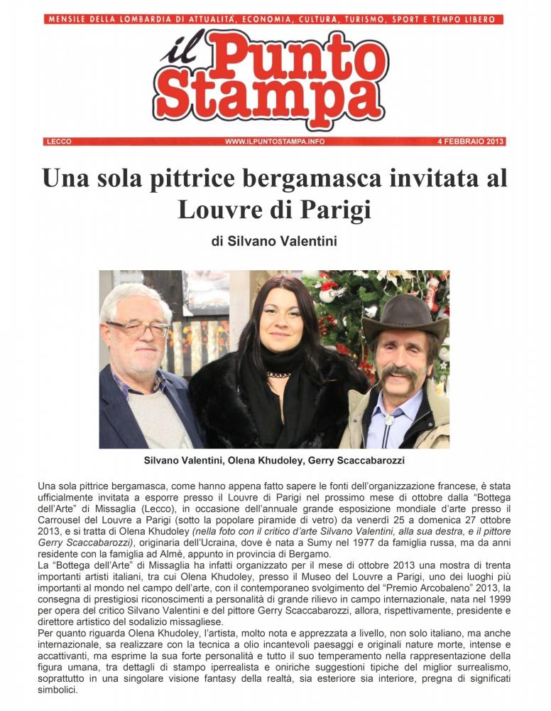 La “Bottega dell’Arte” di Missaglia ha infatti organizzato per il mese di ottobre 2013 una mostra di trenta importanti artisti italiani, tra cui Olena Khudoley, presso il Museo del Louvre a Parigi, uno dei luoghi più importanti al mondo nel campo dell’arte, con il contemporaneo svolgimento del “Premio Arcobaleno” 2013, la consegna di prestigiosi riconoscimenti a personalità di grande rilievo in campo internazionale, nata nel 1999 per opera del critico Silvano Valentini e del pittore Gerry Scaccabarozzi, allora, rispettivamente, presidente e direttore artistico del sodalizio missagliese.